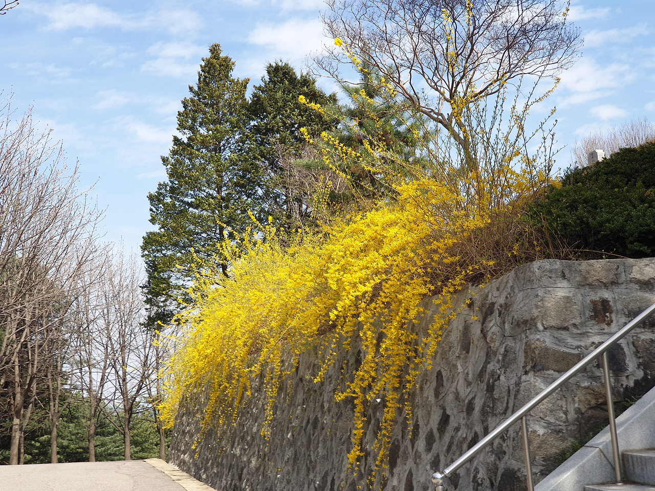 현충원에는 벚꽃도 한창이었지만 노란 개나리도 절정이었다. 날이 좋아서인지 파란 하늘과 대비되어 노란빛이 더 화사했다. 아래에서 위를 올려다보니 하늘에 별이 떠있는 것 같았다.