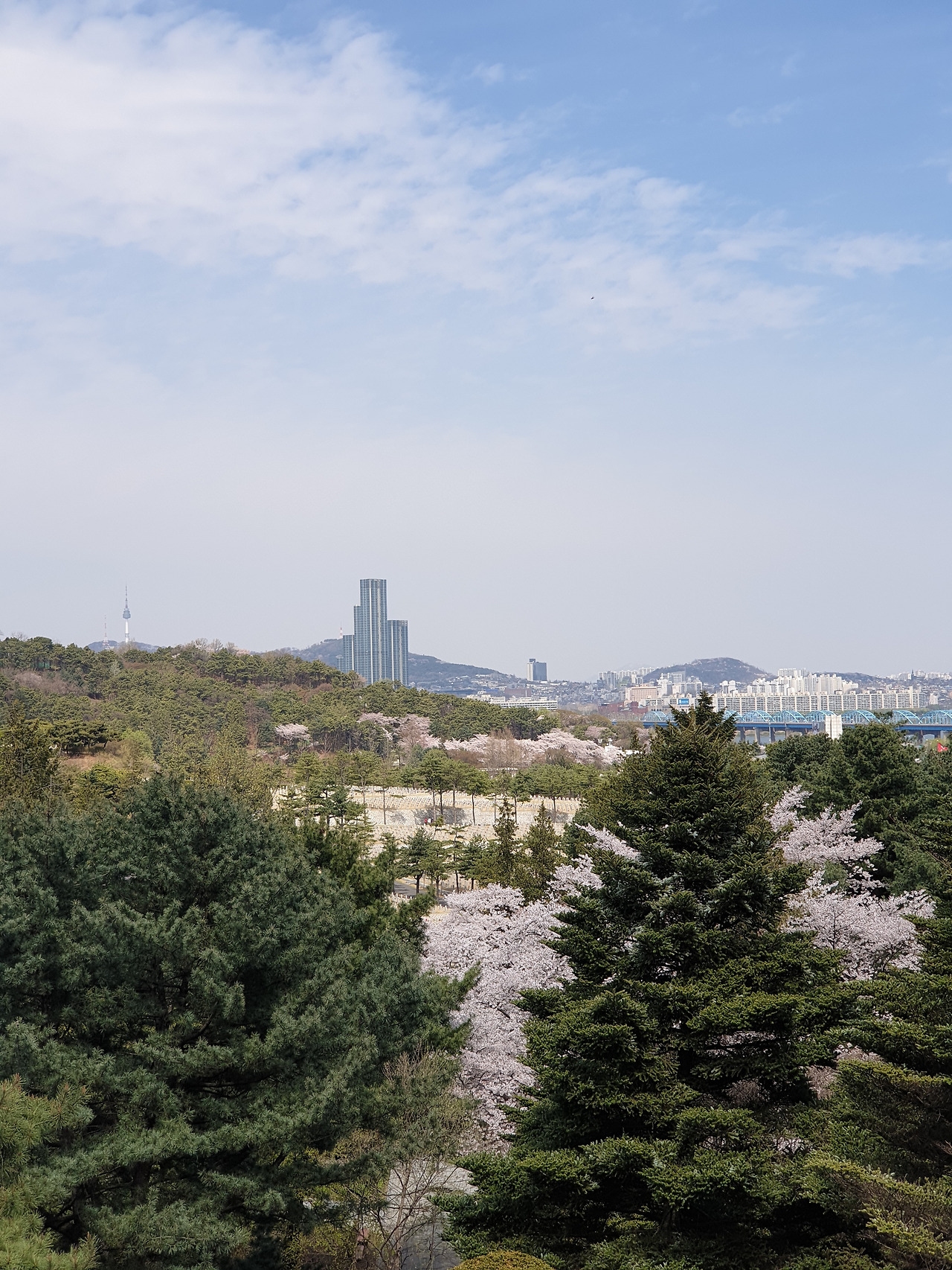 요근래 서울에 들를 때마다 미세먼지가 가득 꼈던터라 어디든 먼 곳은 잘 보이지 않았다. 이날은 맑은 하늘 아래 또렷하게 타워가 보였다. 푸르른 나무들과 핑크빛 벚꽃들이 현충원을 감싸고 있었다.