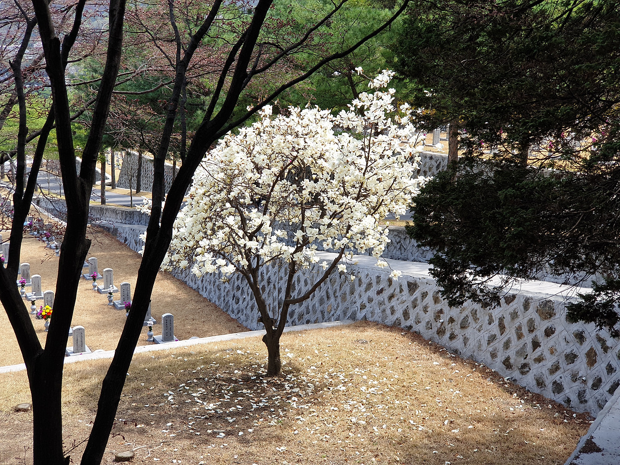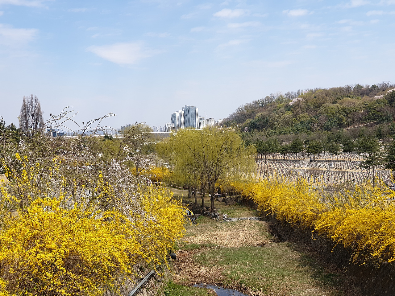 솟아오른 빌딩들이 멀리 보이고 푸른 하늘 아래에는 무수히 많은 비석들이 있었다. 이렇게 창창한 날 꽃으로 물든 세상 아래 많은 죽음들을 생각하니 숙연해졌다. 비석마다 지역과 연도가 적혀있었다. 특히 '전사'라는 단어가 가슴 아프게 다가왔다. 연도를 살펴보니 아마도 6.25 전쟁 때 돌아가신 분들인 것 같았다. 비석에 이름이 없어 더욱 더 슬프게 느껴졌다.