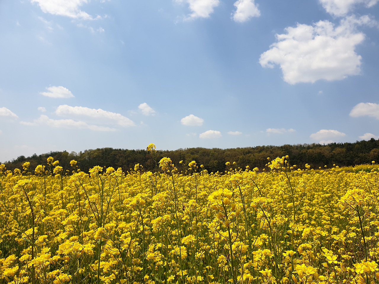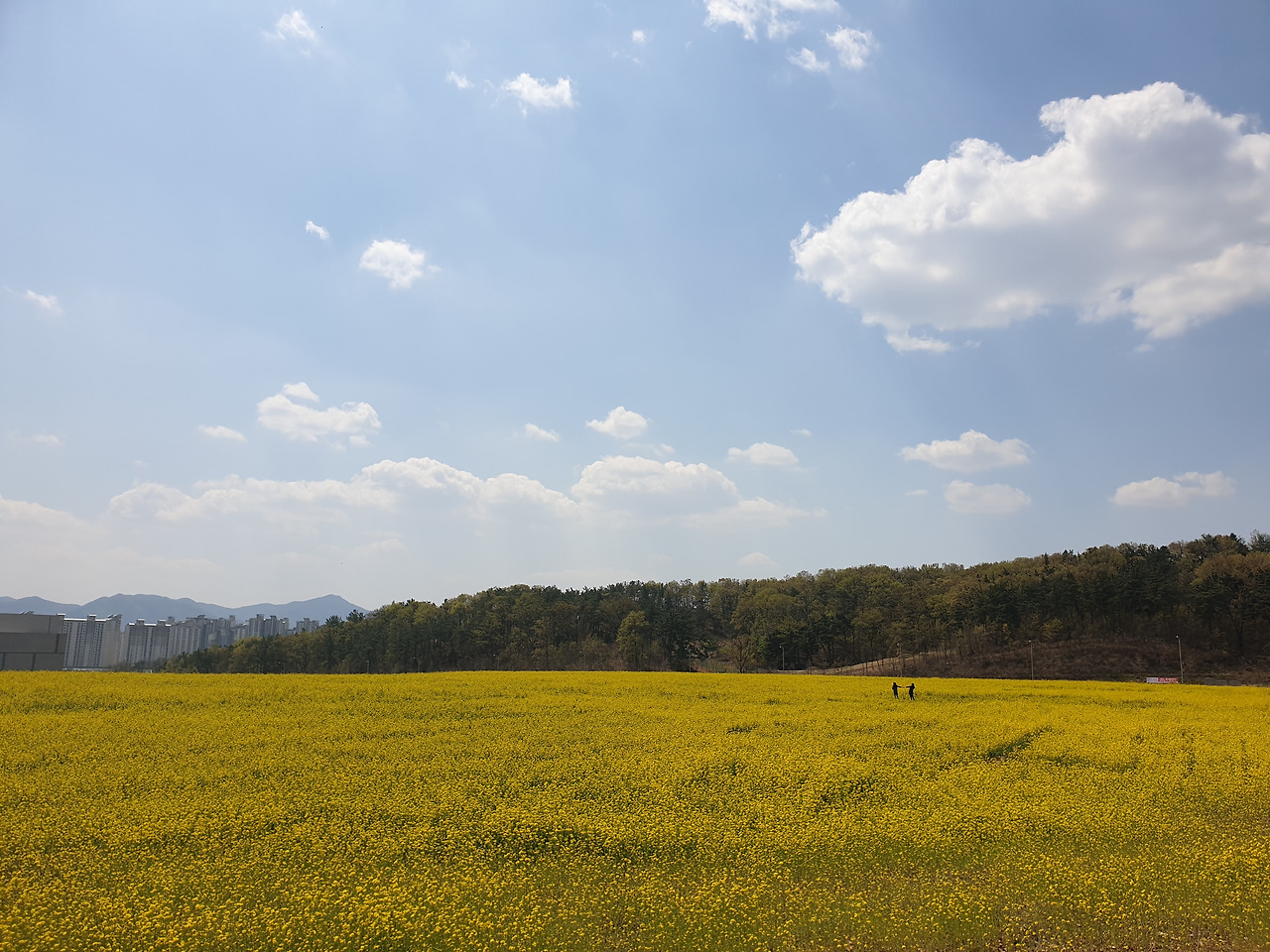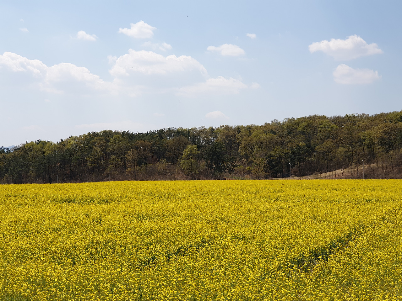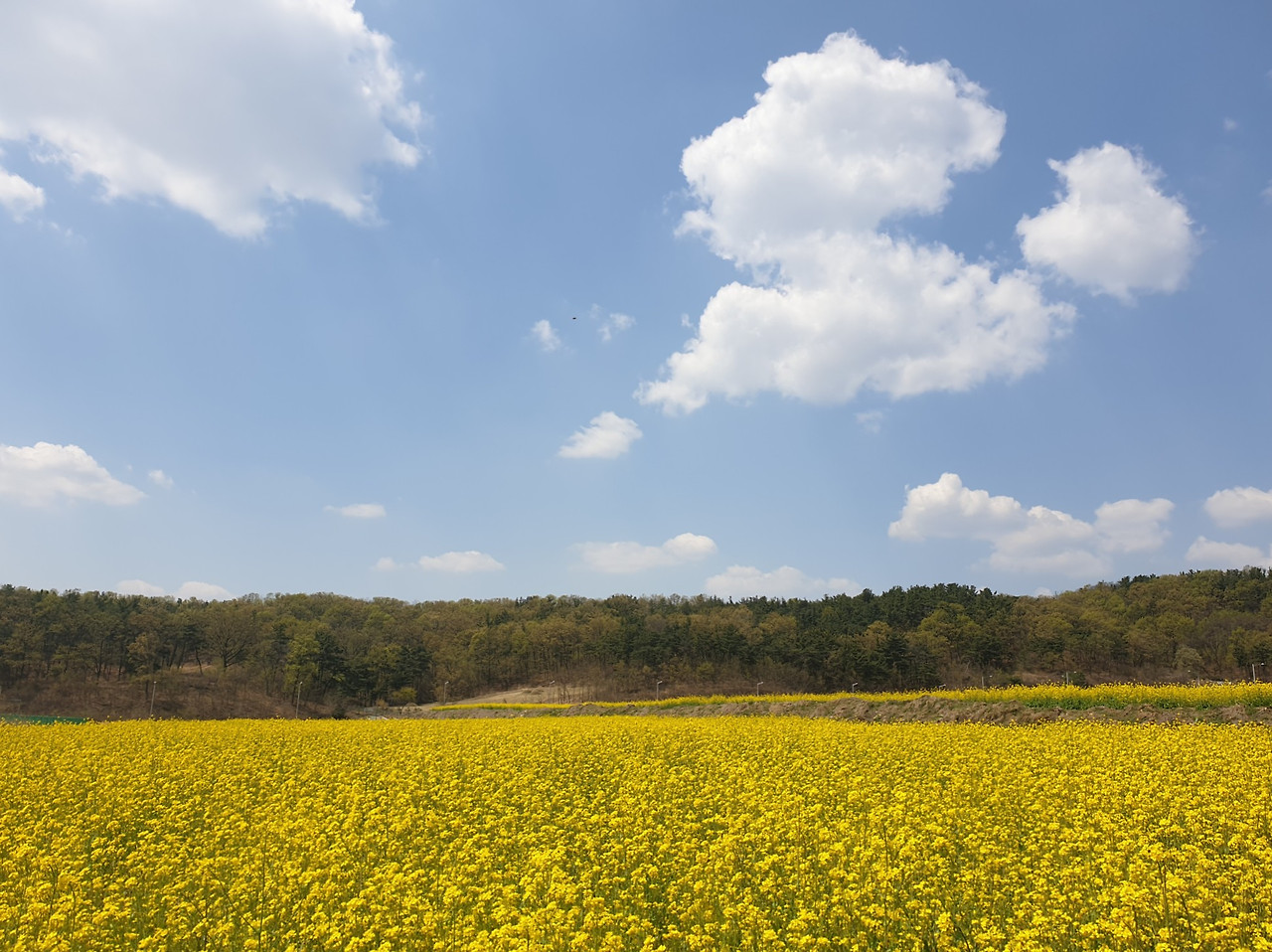 진한 파란색에 흰 물감을 탄 듯한 하늘빛이었다. 그 하늘에 몽실몽실 손에 잡힐 것만 같은 흰 구름이 둥둥 떠있었다. 이리도 맑은 하늘 아래 펼쳐진 노란 물결은 내 두 눈에 한번에 담기지 않을 정도로 넓었다.