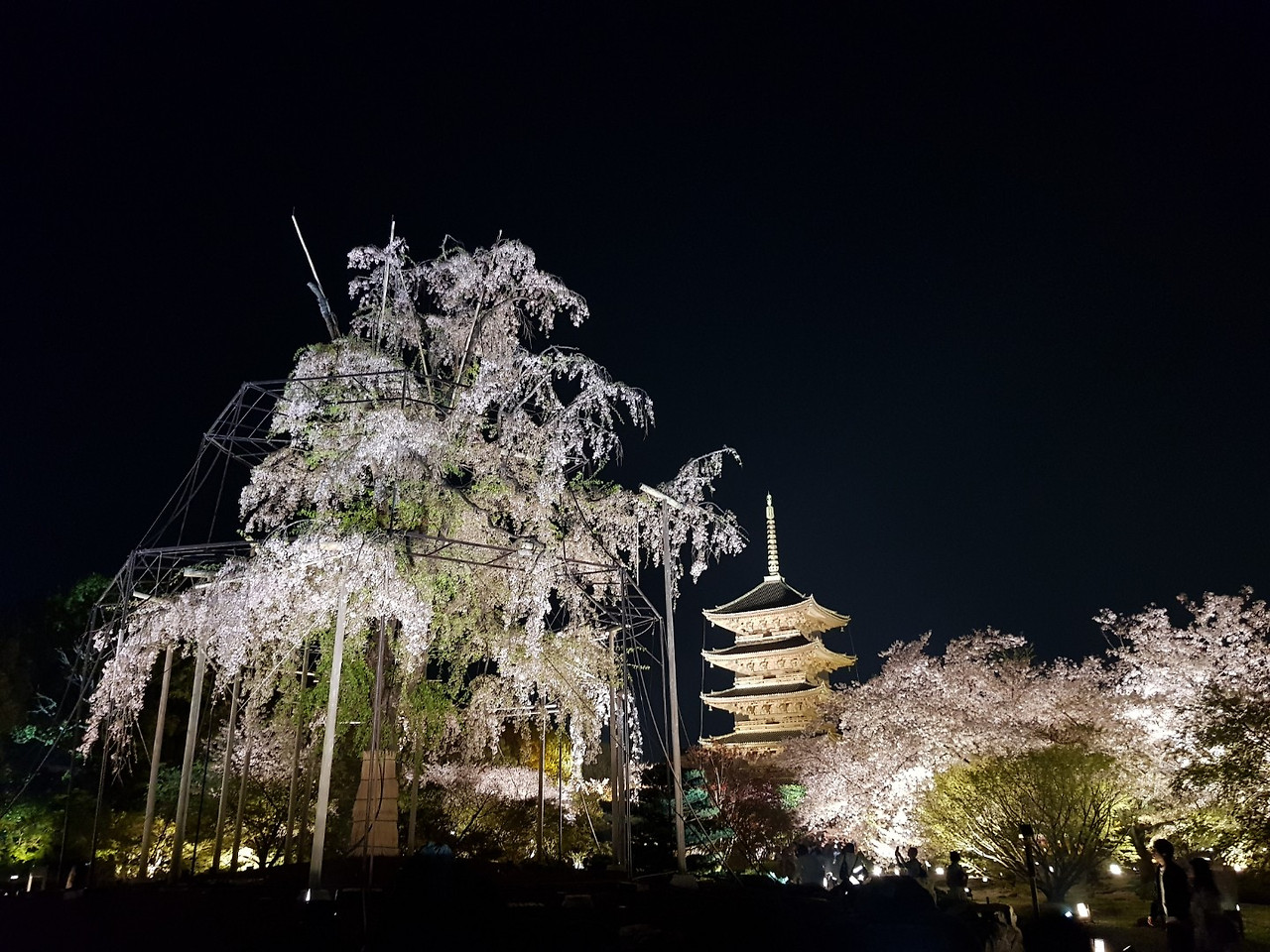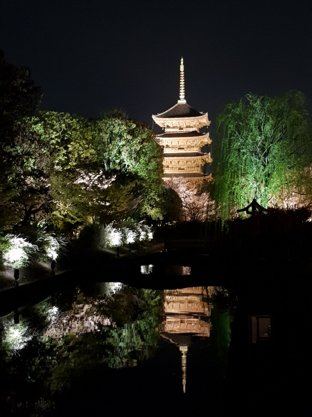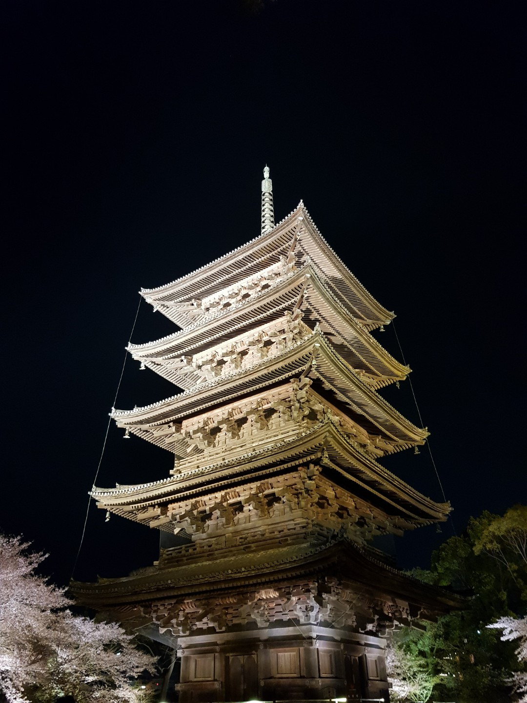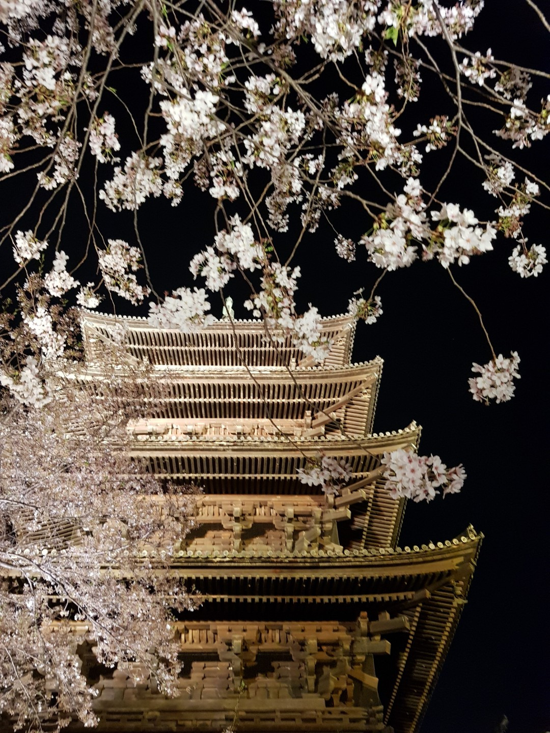 목탑은 노란 조명을 받아서 금빛으로 반짝였다.