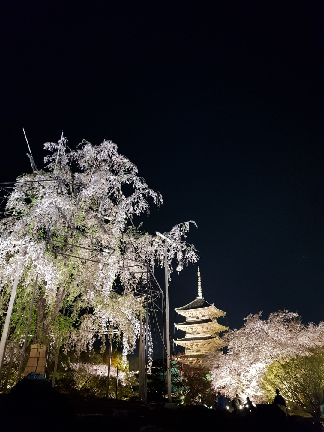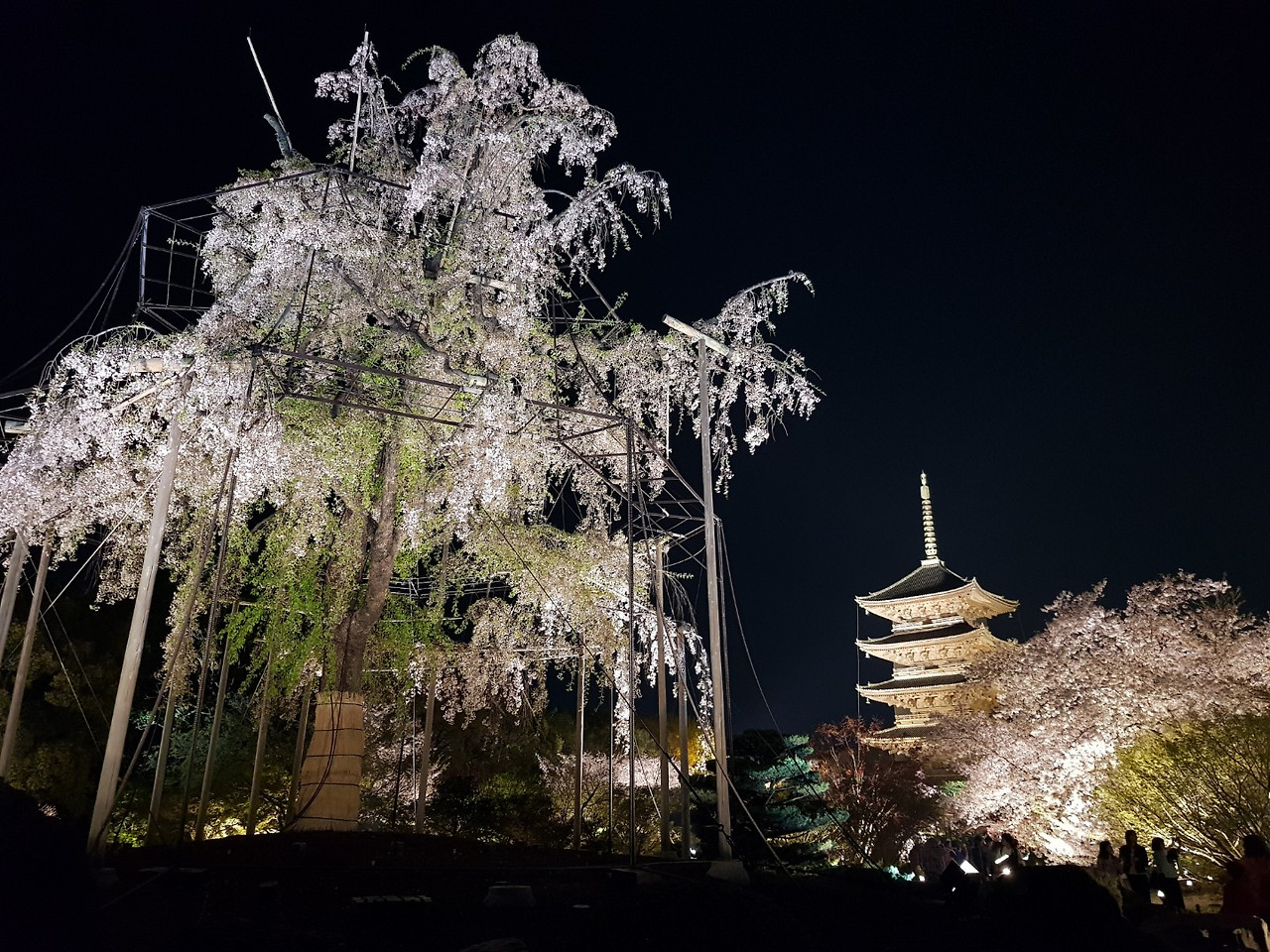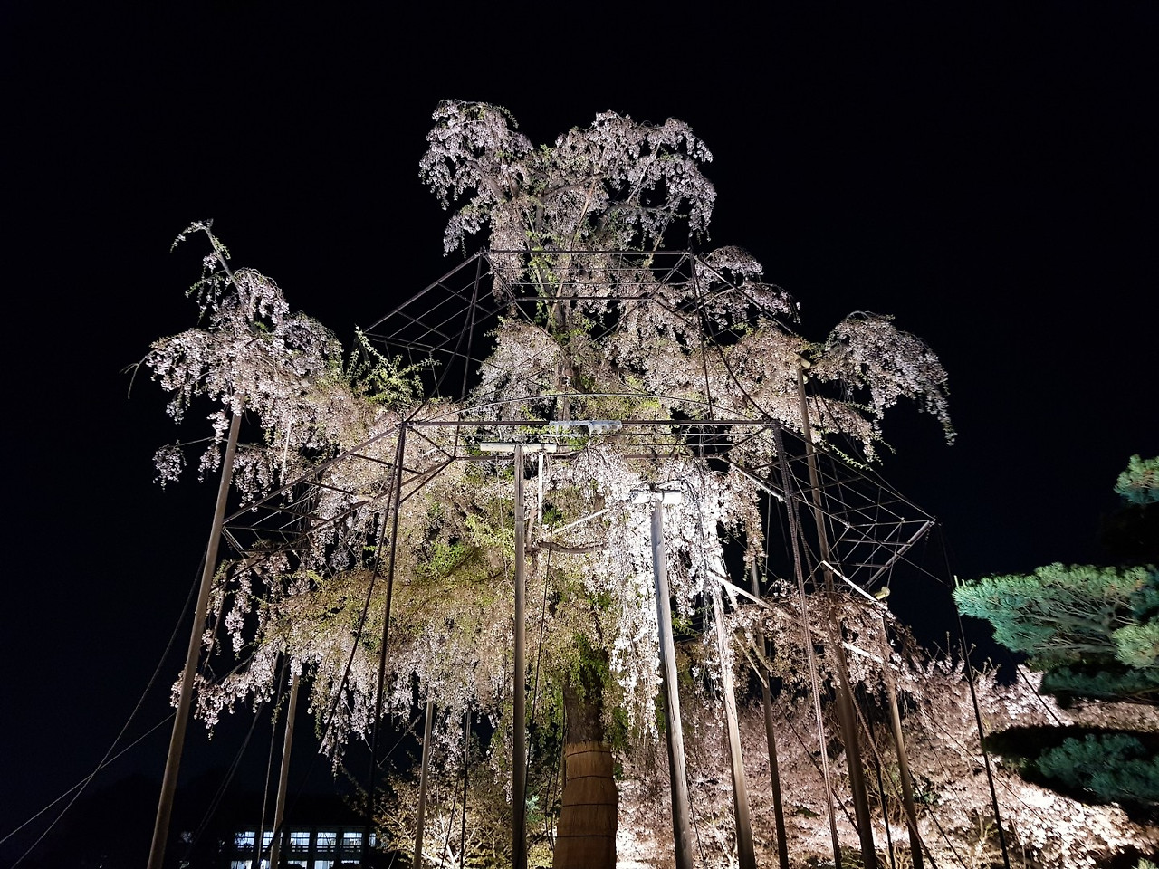 가지 사이사이마다 나무 기둥이 벚나무를 받치고 있었다.