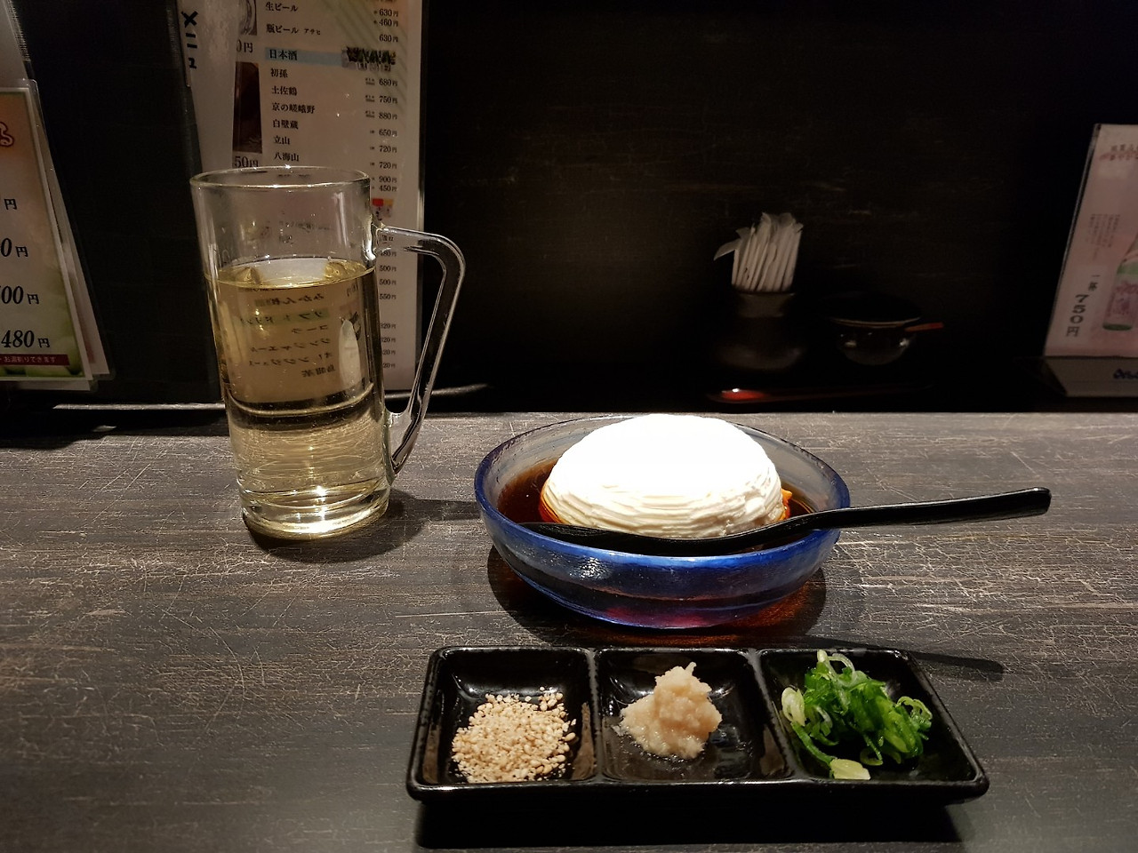 와규, 모찌리 두부, 따뜻한 도쿠리 하나를 시켰다.