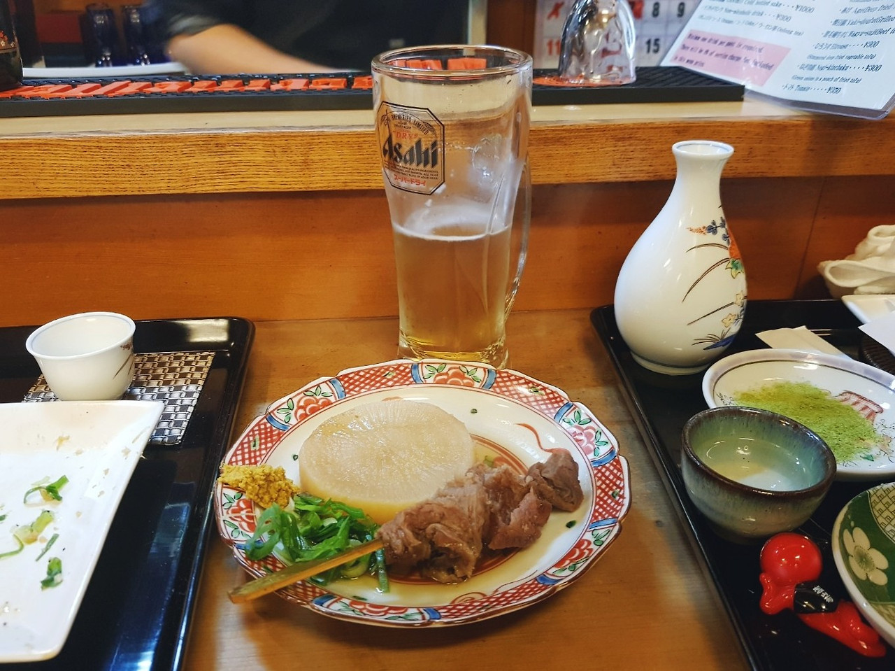 우린 구글 평점이 높은 어느 식당에 찾아 들어갔다. 하지만 만석에다가 예약도 꽉 차있어서 오늘은 불가능하다는 말을 듣게 되었다. 꿩 대신 닭이라고 바로 옆 어느 조그만 이자카야에 들어갔다. 겨우 사람 한명이 지나다닐 공간에 바 테이블이 길게 놓여 있었다.