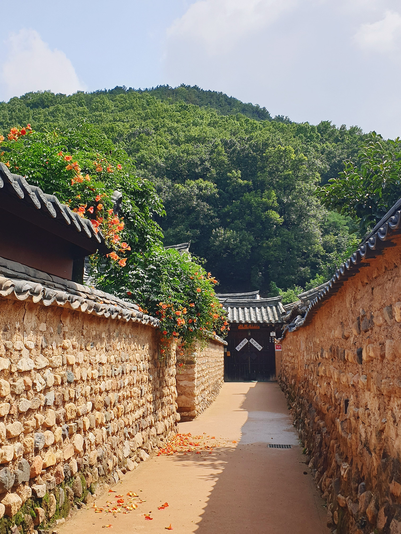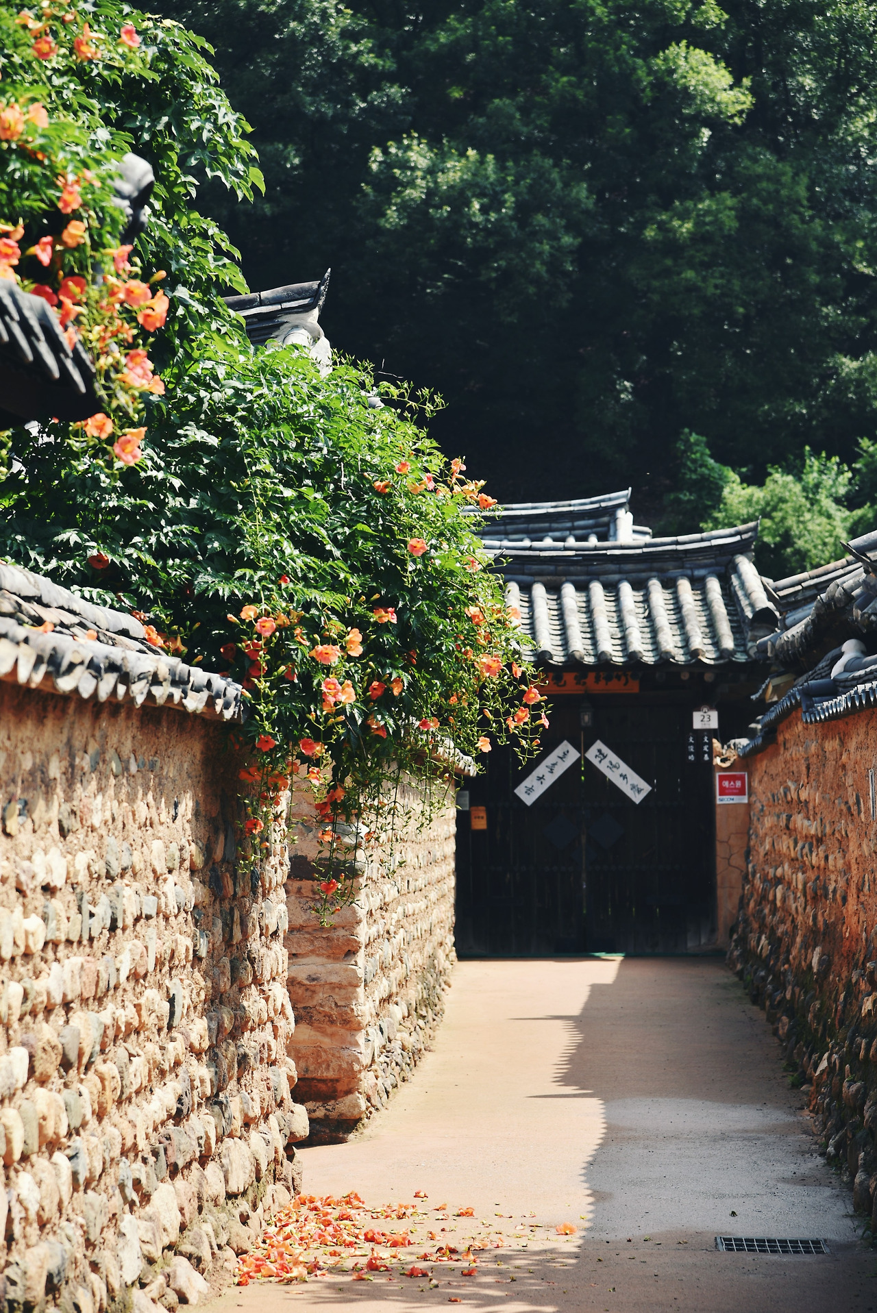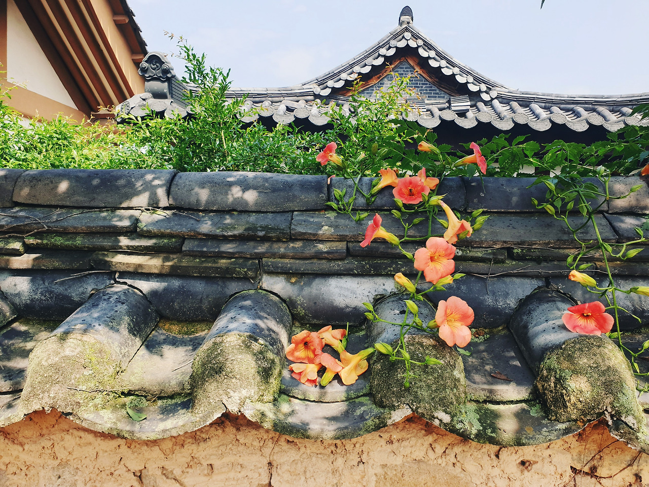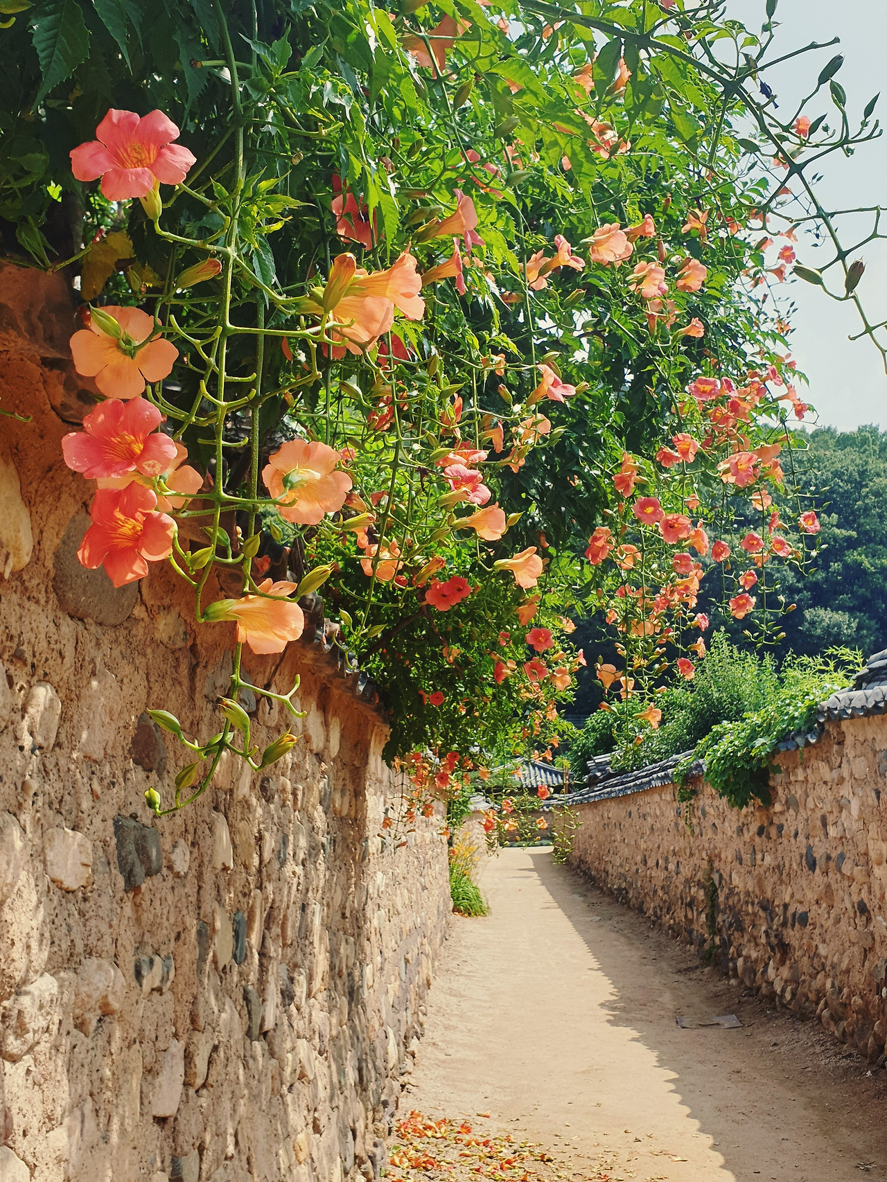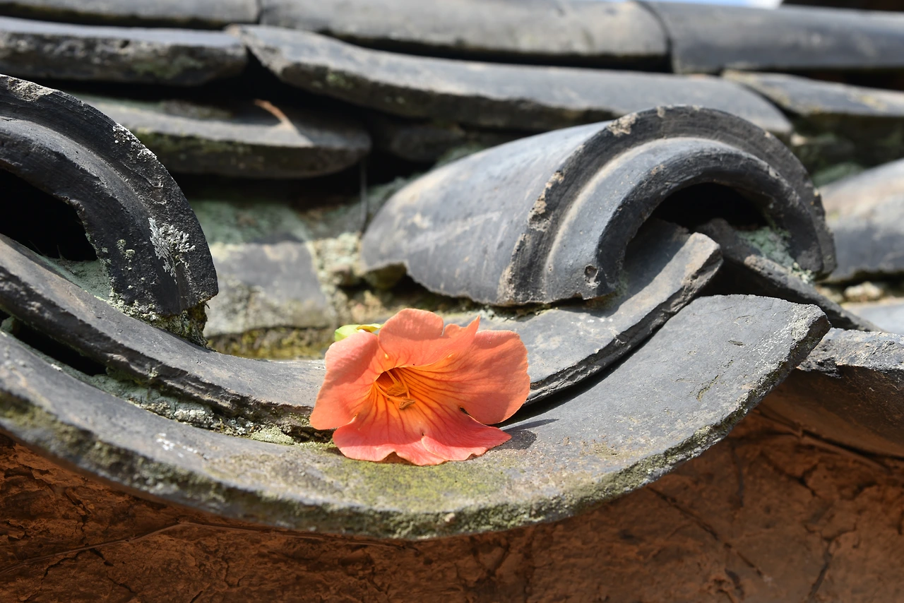 능소화가 가득 피어났단 소식을 듣고 남평문씨본리세거지로 향했다. 4년전 여름날 나홀로 이곳에 찾아와 토담 사이를 걸었다. 혼자 버스에 올라 알 수 없는 길들을 굽이굽이 지나 인흥마을 어느 버스 정류장에 도착했다. 세거지까지 땀을 뻘뻘 흘리며 걸었다. 그 때는 7월 말 무더위가 한창인 시기였고 능소화는 거진 다 저물어 있었다. 그래도 한 두송이 희미하게나마 피어있던 꽃을 보고 얼마나 기뻐했는지 모른다.