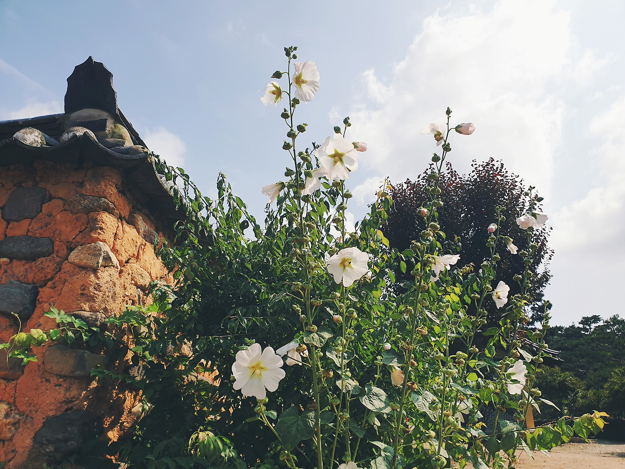 그 때의 기억이 어렴풋이 내 머릿속에 남아있었나보다. 길가에 피어나 있는 능소화를 볼 때마다 어렴풋이 이곳이 떠올랐다. 추억을 안고서 떠나는 길은 더 설레인다. 아침부터 부지런히 달려 세거지에 도착한 시간이 오전 10시 즈음이었다. 그런데 이미 주차장은 차들로 가득했다. 모두들 능소화를 보러 왔나보다. 세거지는 능소화 뿐만 아니라 접시꽃도 한창이었다. 하얀색, 분홍색, 빨간색 큰 꽃잎들이 활짝 폈다. 하늘로 쭉쭉 뻗어난 줄기 위에 매달린 커다란 꽃잎이 시원시원했다. 수없이 달린 꽃봉오리들은 이제 곧 터질것처럼 한껏 부풀어 있었다.