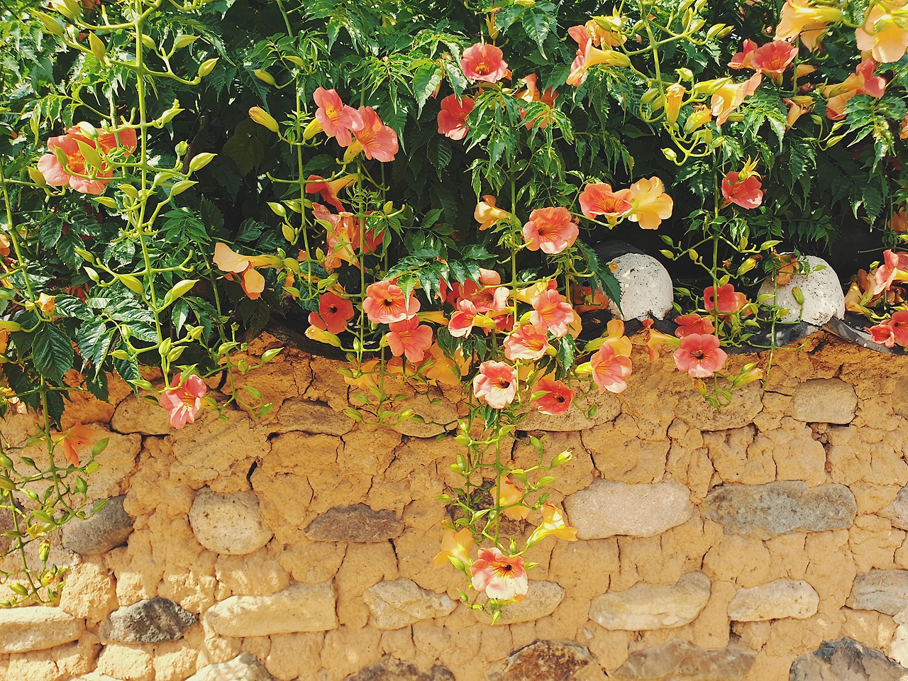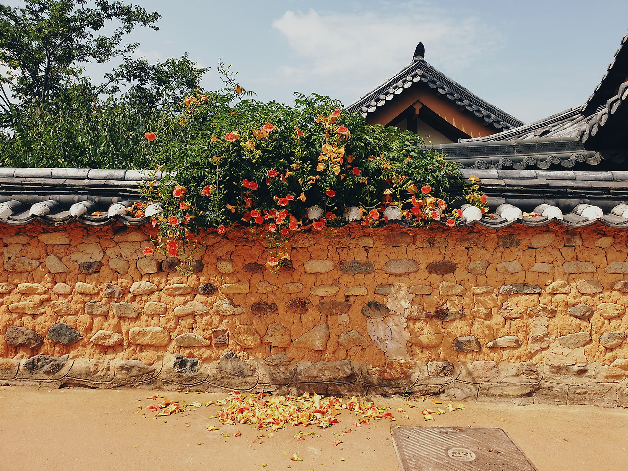 카메라를 어깨에 둘러매고 토담 사이로 걸었다. 능소화 덩쿨이 기와지붕을 타고 넘어 토담 아래로 내려와 주렁주렁 꽃들을 늘어뜨렸다. 땅 위로는 절정이 지난 꽃송이들이 어지럽게 흩어져 있었다. 토담을 거닐다가 꽃이 활짝핀 송이째로 툭- 떨어지는 장면을 보았다. 그 모습이 온전해서 땅에서 꽃이 피어난 것 같았다. 마치 동백꽃처럼 말이다. 꽃에 가까이 다가가니 벌들이 날아다니는 소리가 귓가에 윙윙 울렸다. 자세히 살펴보니 꽃 송이송이마다 벌들이 내려앉아 열심히 꿀을 모으고 있었다. 사람들은 아름다운 꽃을 보고 기뻐하고 벌들은 신선한 꿀을 찾아 기뻐하고, 무덥지만 사랑스러운 여름이다.
