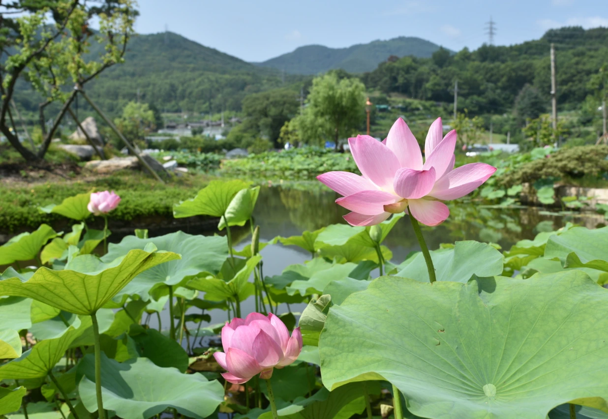 팔뚝만한 렌즈가 달린 카메라를 든 사람들이 능소화를 찍느라 바삐 돌아다녔다. 커다란 삼각대들도 심심피 않게 보였다. 우리도 그 틈에 껴서 열심히 사진을 찍었다. 사진을 어떻게 담아도 두 눈으로 보는 것 보다는 못했다. 하지만 시간이 흘러 이 사진들을 들춰볼 날을 상상하며 차곡차곡 추억들을 담았다. 구불구불 미로 같았던 토담길을 나왔다. 그윽한 연꽃 향기가 코 끝을 찔렀다. 푸르른 연잎들이 초록 바다처럼 펼쳐지고 그 위로 듬성듬성 연꽃들이 피어났다. 전날 비가 왔던 탓일까 연잎 위로 동글동글 물방울들이 굴러다니고 있었다. 작렬하는 태양 때문에 등줄기로 땀이 흘러내렸지만 아름다운 풍경 앞에서 잠시 더위도 잊었다.