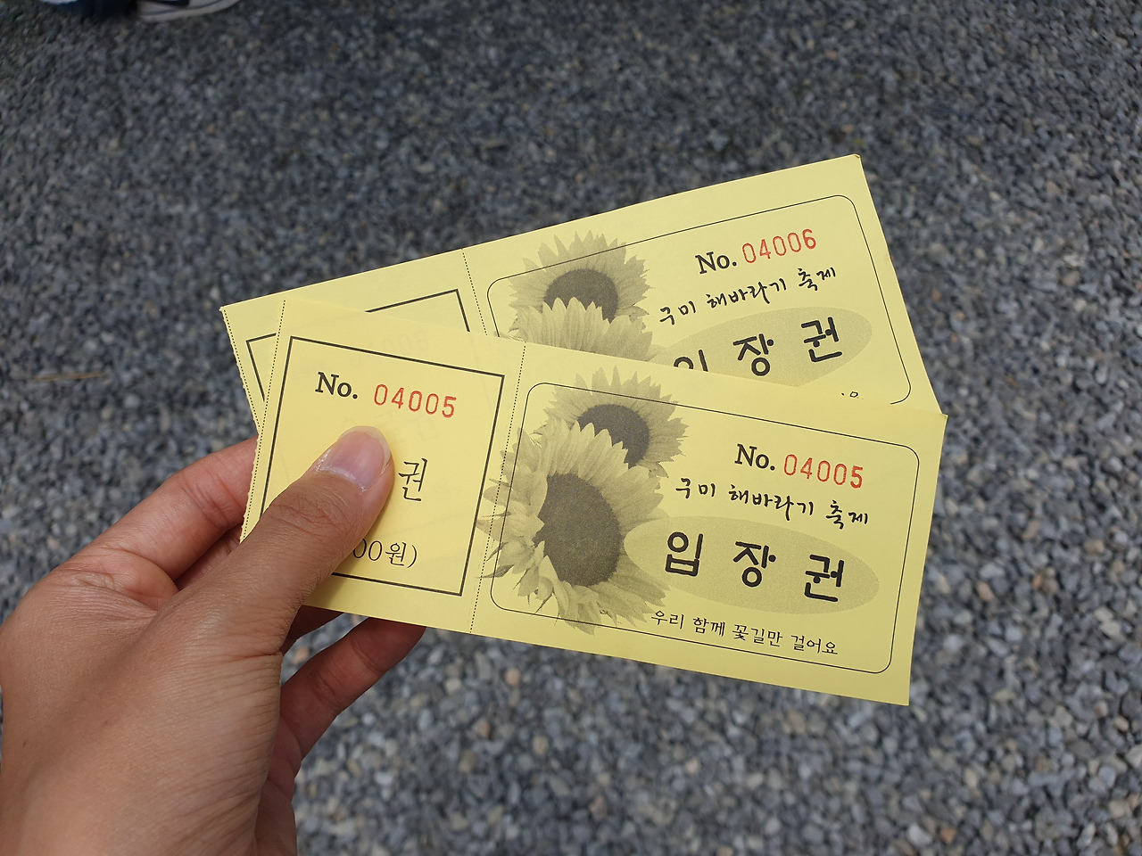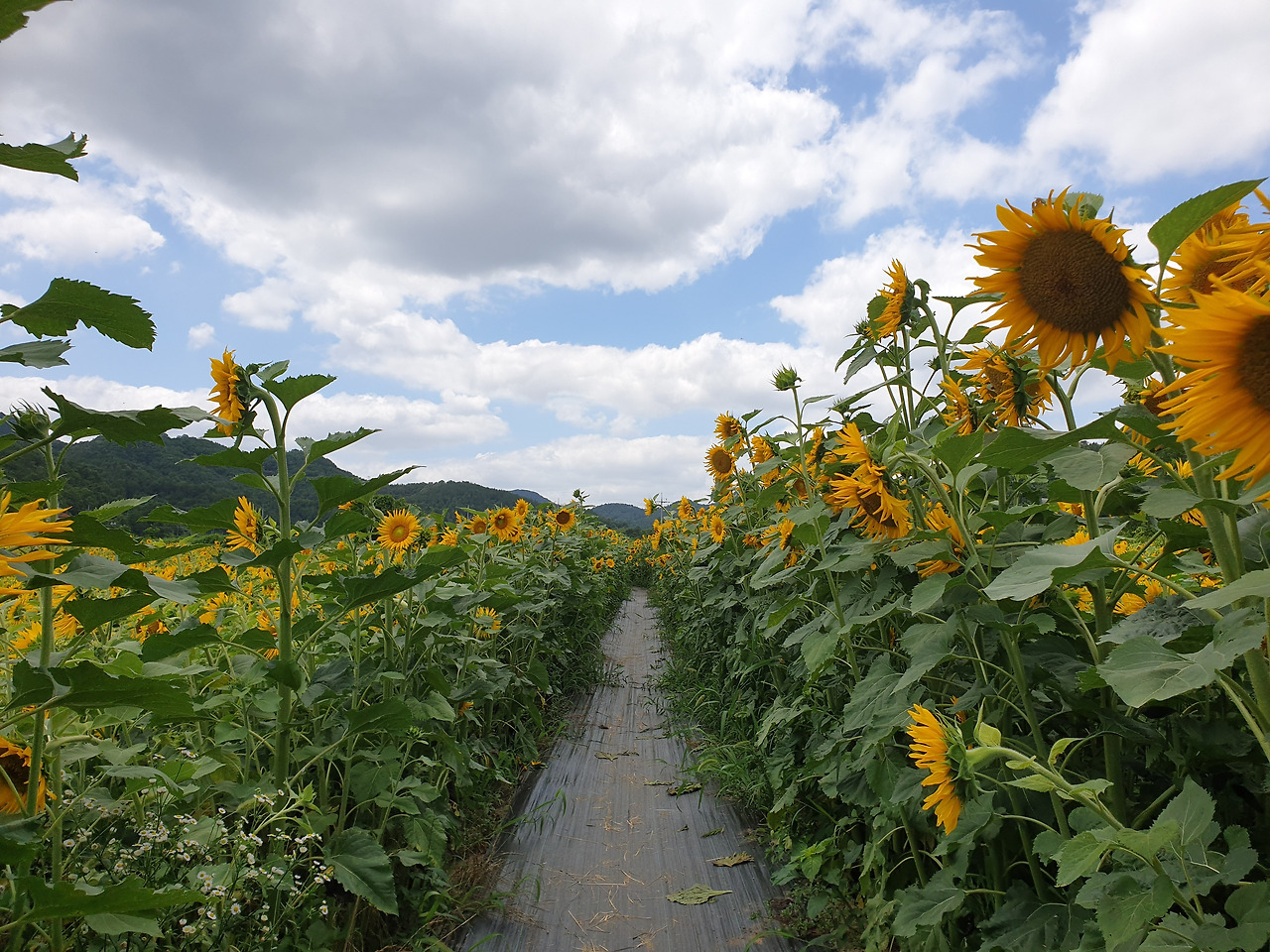 입장권은 인당 3천원이다. 음료를 교환할 수 있는 천원 이용권을 주는데 해바라기 밭을 다 둘러보고 와서 쏠쏠하게 써먹었다. 논두렁 길을 따라 걷다가 해바라기로 가득한 노란 물결 속으로 풍덩- 들어갔다. 꽃들 사이사이로 길이 나있었는데 걷기 편하게 검은 비닐로 싸여 있었다.