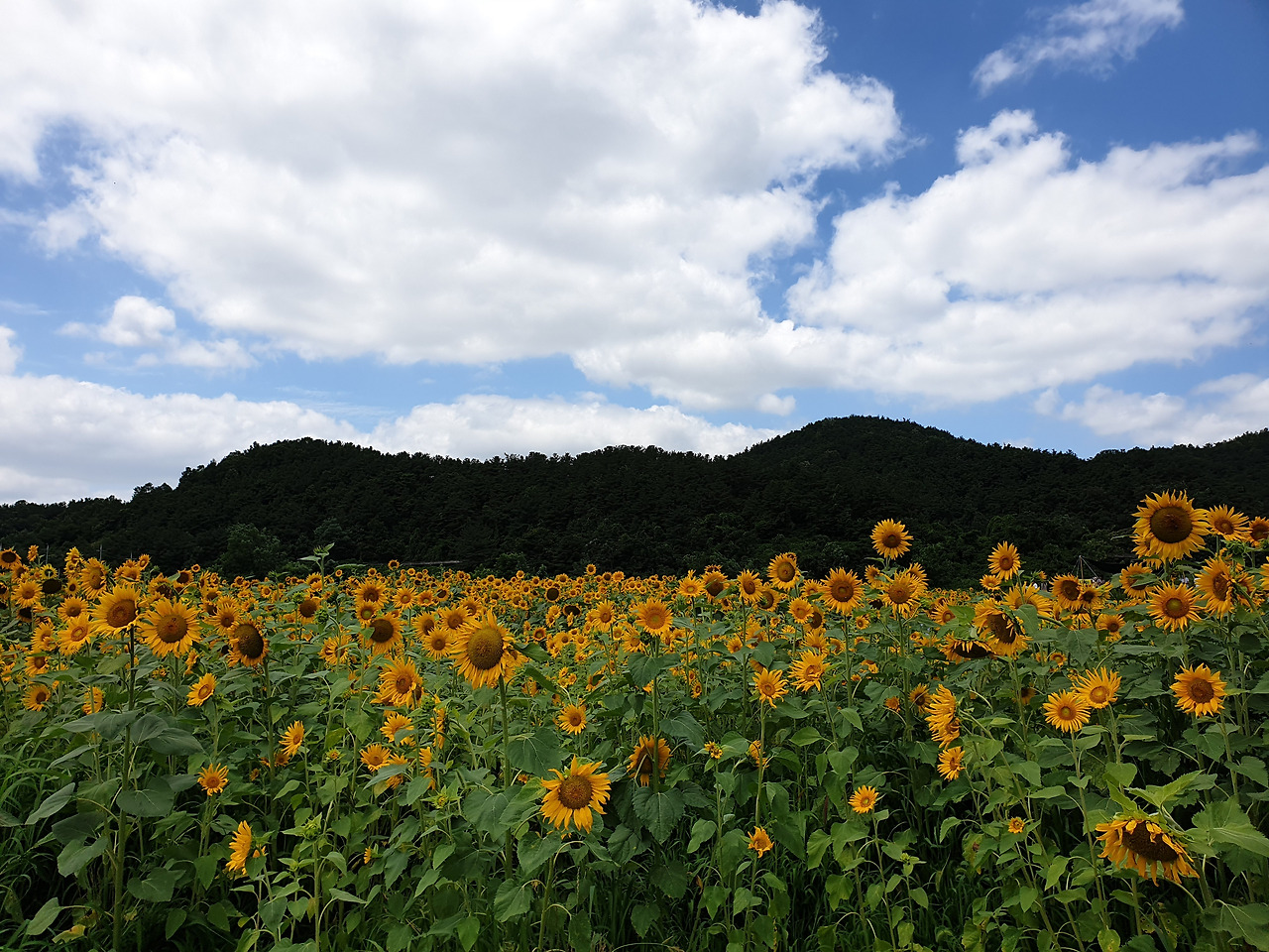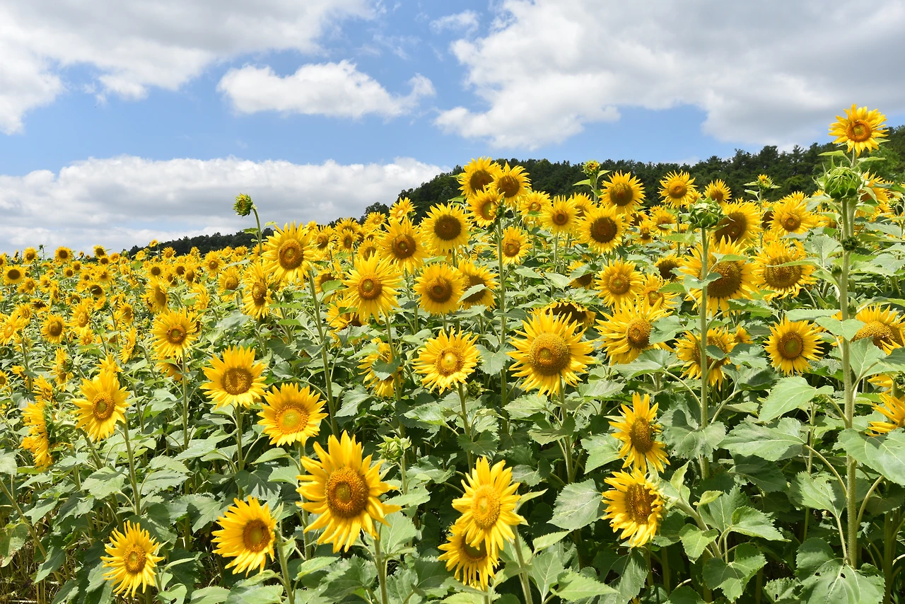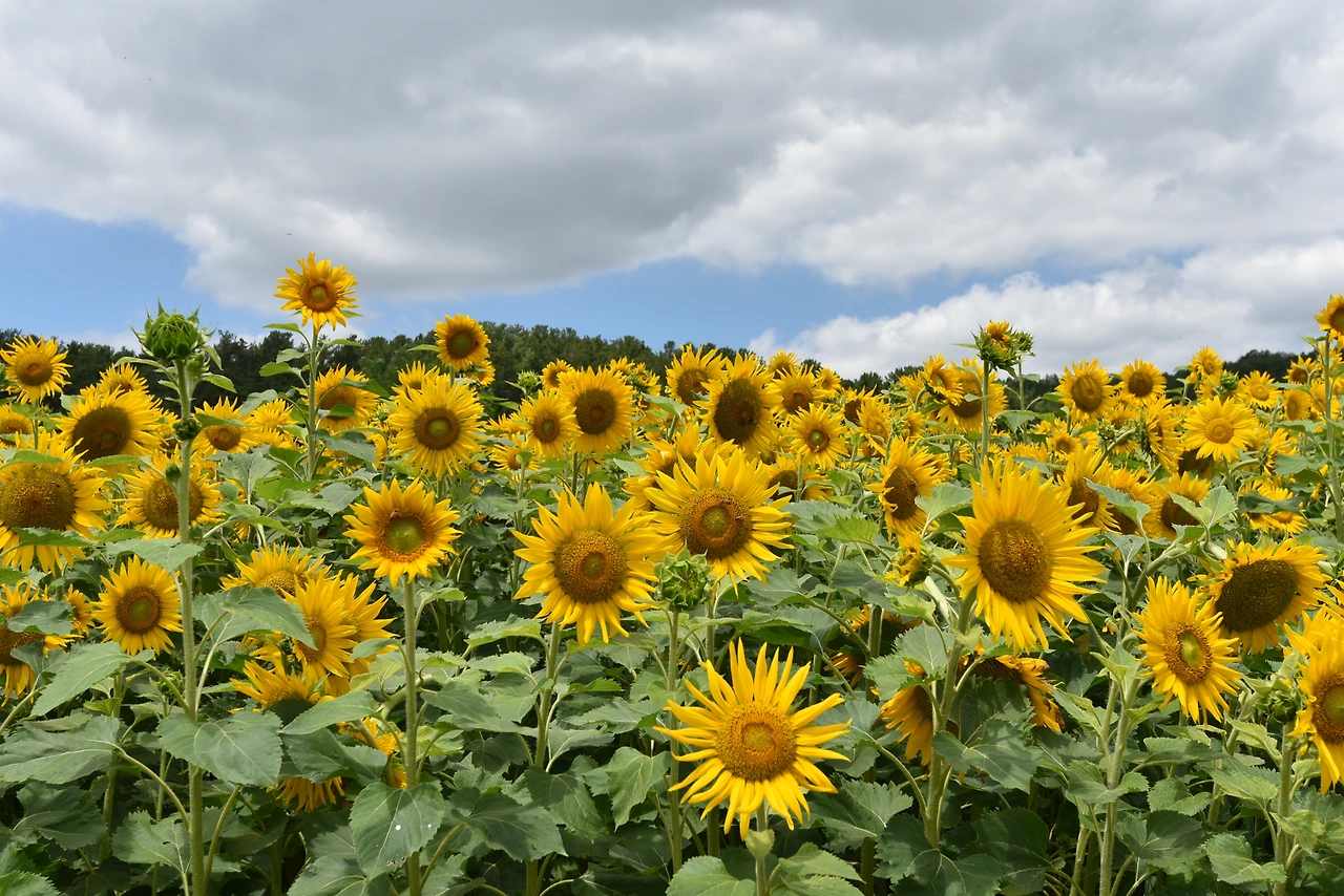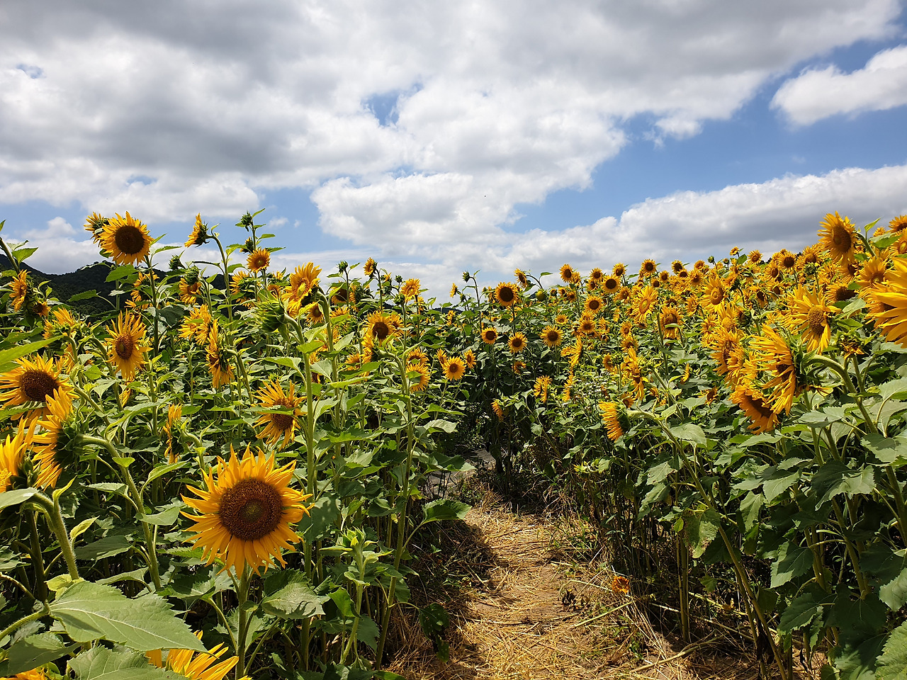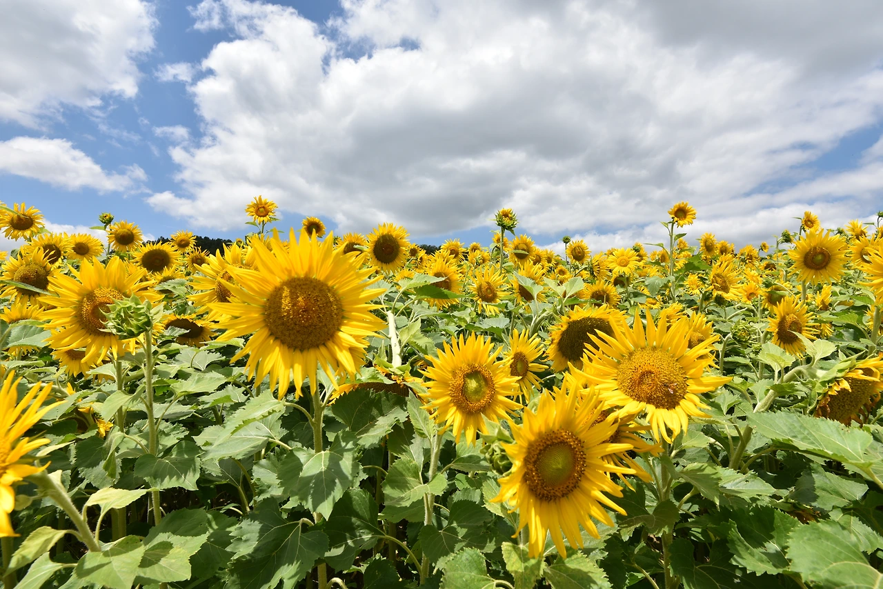 노오란 해바라기들이 끝도 없이 펼쳐졌다. 온 사방이 해바라기였다. 해바라기들은 갓 피어난 듯 생기가 넘쳤다. 노란 물결 위로 눈부시게 푸른 하늘이 보이고 그 위로 새하얀 구름들이 둥둥 떠다녔다. 왜 이렇게 날씨가 좋던지! 맑은 하늘과 함께라서 해바라기가 더 아름다워 보였다.