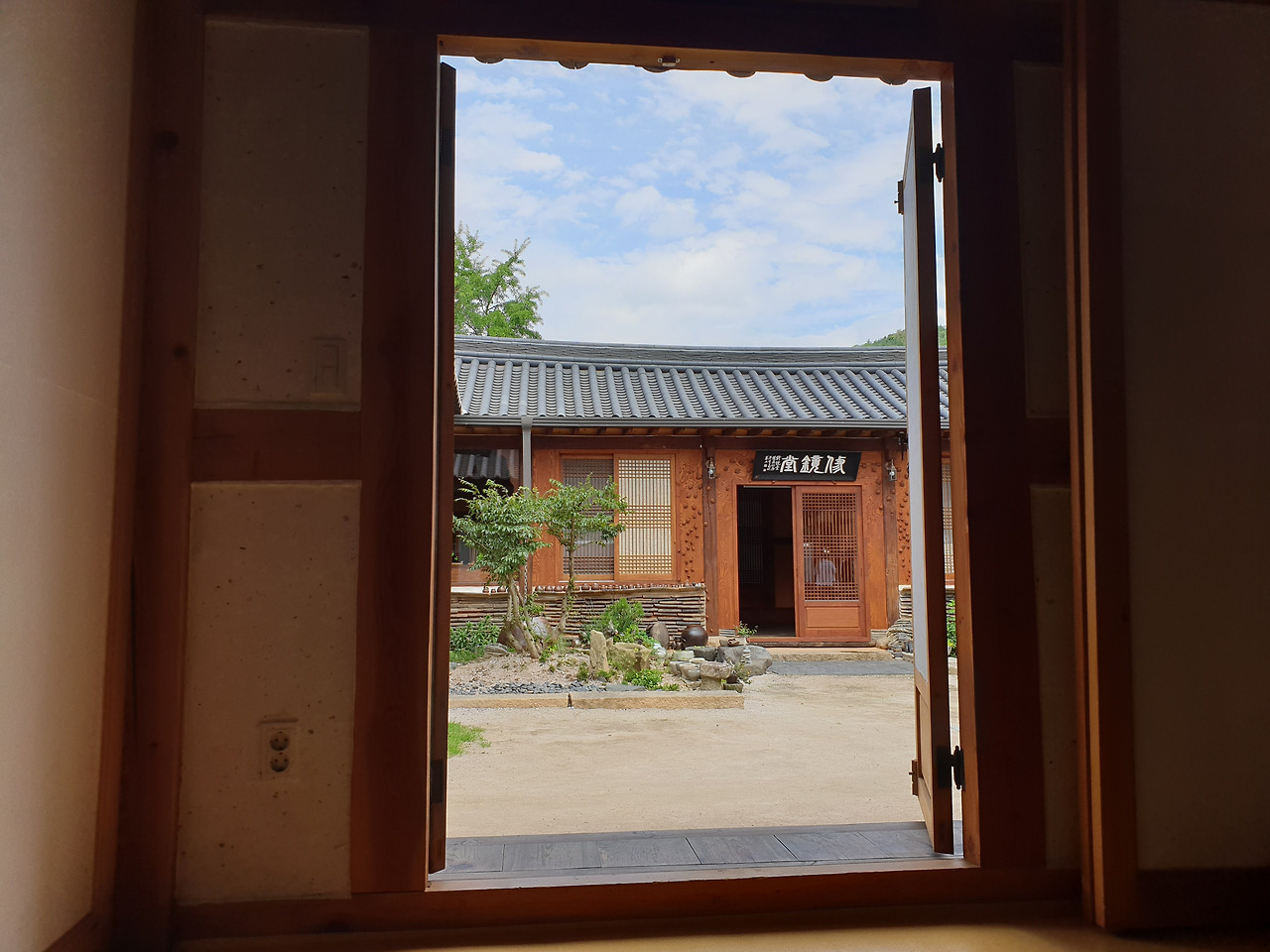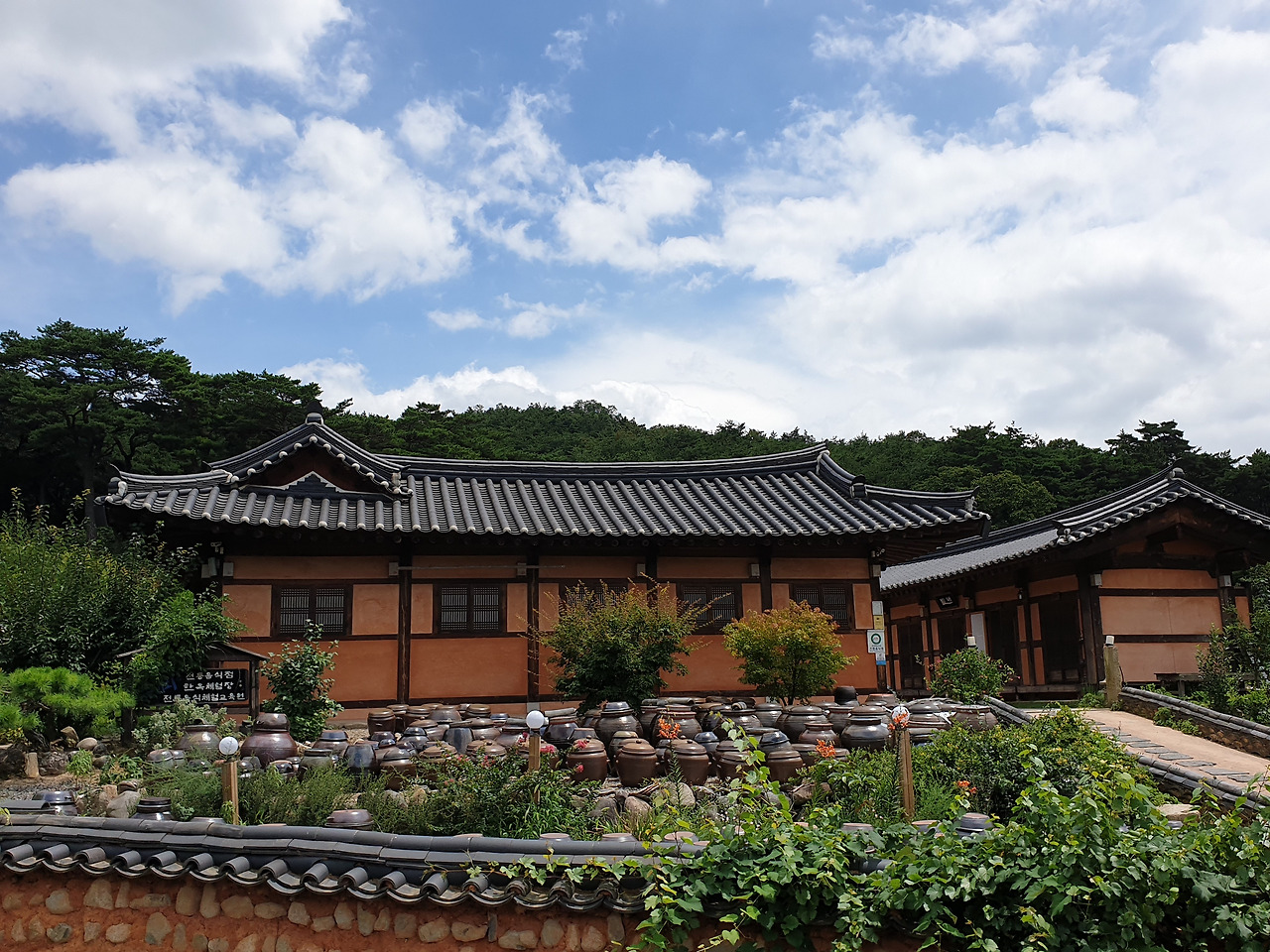 용산회식당 주차장 근처에 식당 안내 팻말이 하나 서있었다. 수리뫼라는 식당이었는데 인터넷으로 검색해보니 평이 괜찮아서 찾아가보기로 했다. 장독대들이 즐비한 근사한 한옥 안으로 들어갔다. 우리는 에어컨 빵빵한 실내에 자리잡고 앉았다. 열린 문 너머로 파란 하늘이 보였다. 시원한 상태에서 보는 여름 풍경은 참 싱그럽다.