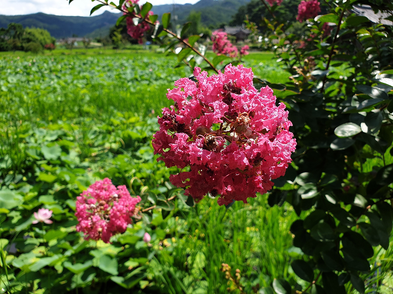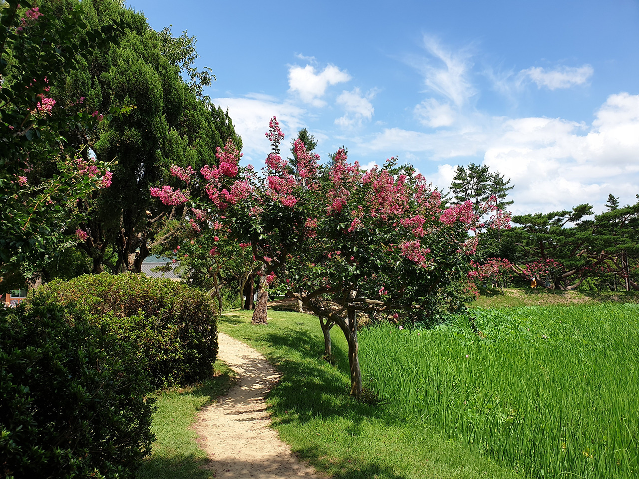 푸른 하늘에 파릇파릇한 풀들이 싱그러운 여름, 하지만 차 밖으로 나서는 순간부터 푹푹찌는 더위에 숨이 막힐 것 같았다. 그래도 서출지 한바퀴는 돌아야지 맘먹고 못 둘레를 따라 걸었다. 배롱나무는 지금 한창이었다. 분홍빛 꽃들이 탐스럽게 피어나 있었다. 배롱이라는 이름은 참 귀엽고 듣기에 좋다. 그런데 이름과는 달리 모양새는 귀엽다기 보다 고고하고 기품있어 보인다.