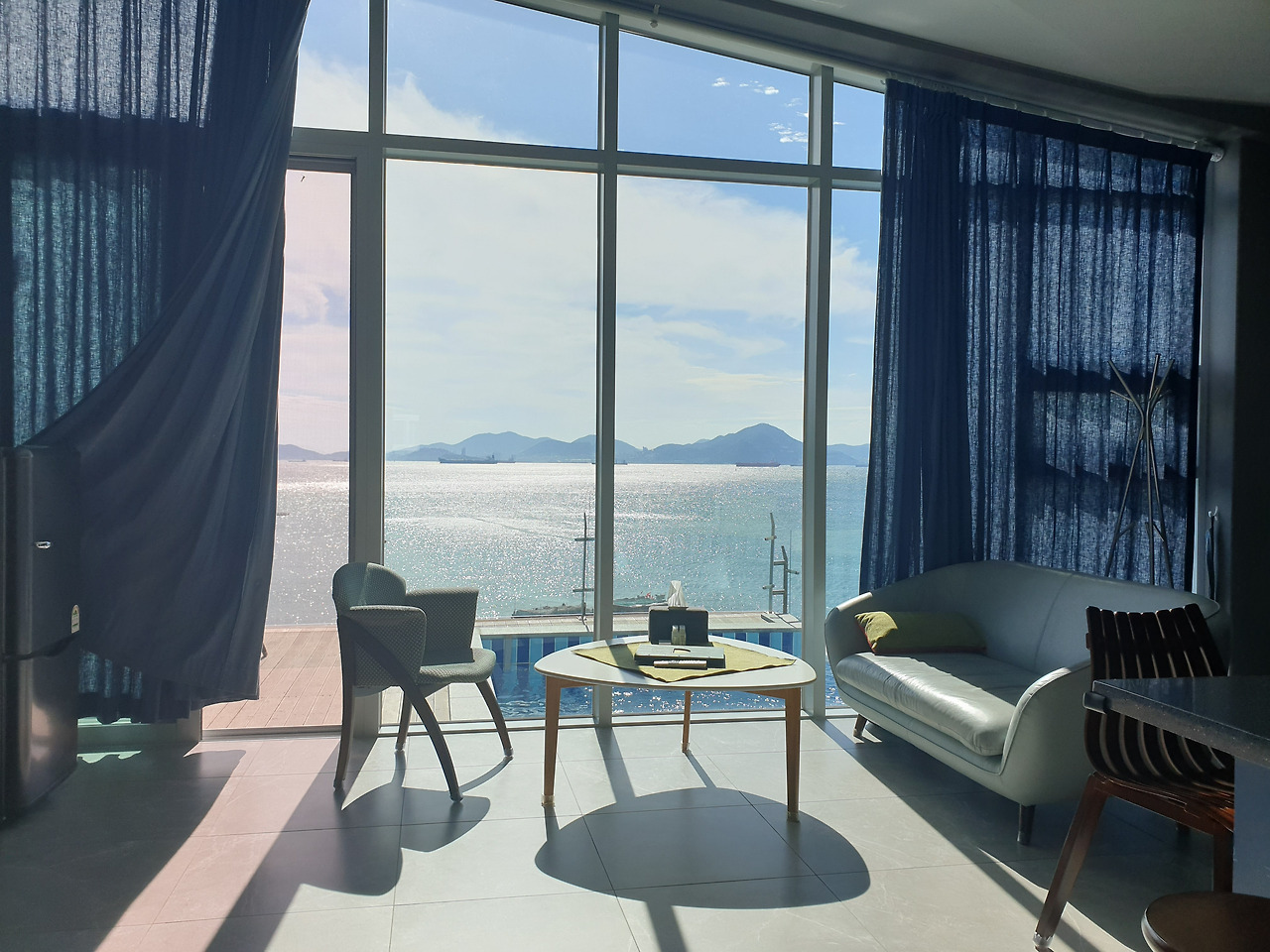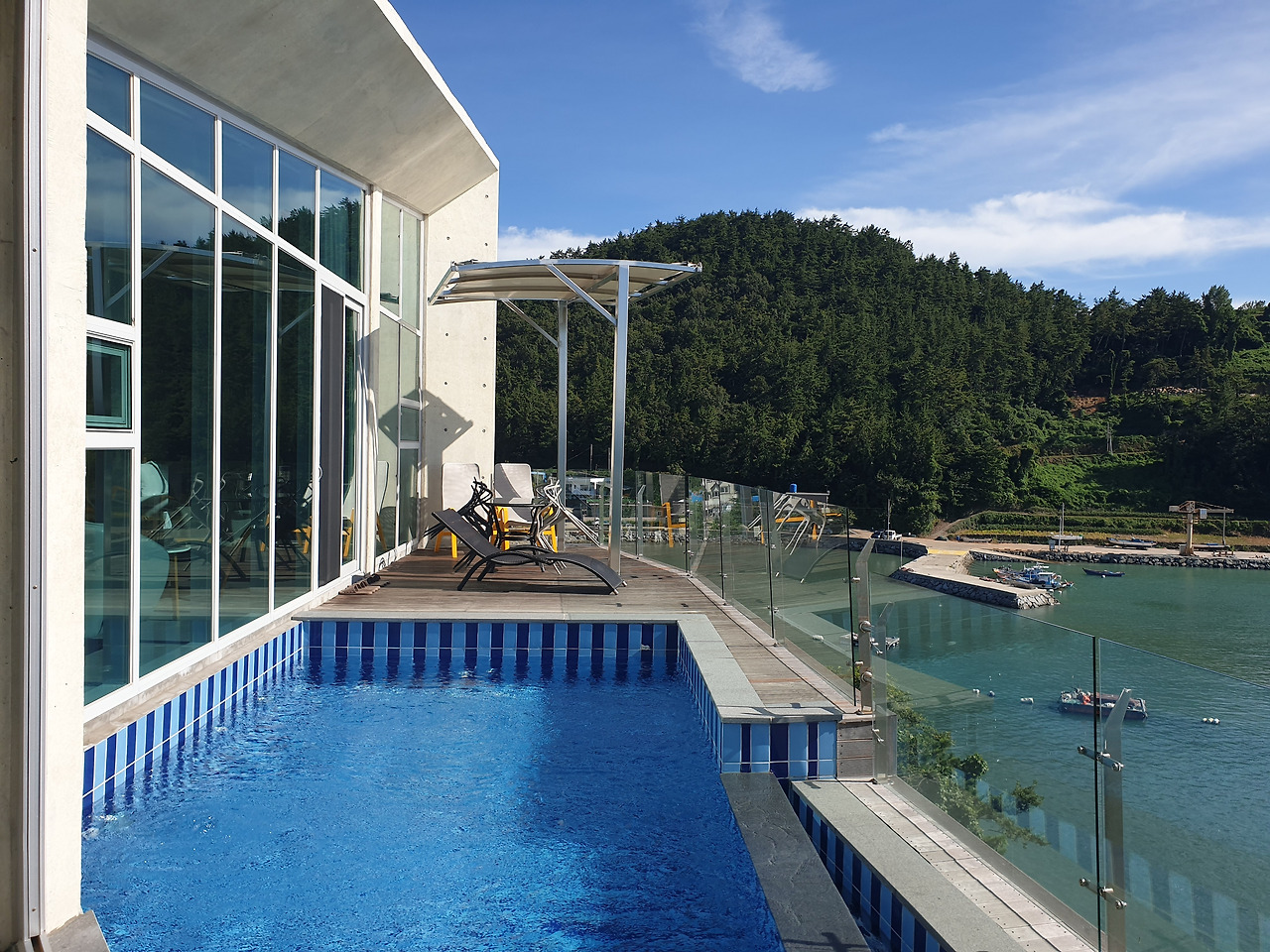 숙소는 참 깔끔했다. 화장실, 부엌, 거실 모두 다 깨끗하게 잘 정돈되어 있었다. 무엇보다 바깥에 보이는 바다가 너무 아름다워서 좋았다. 때마침 날씨도 좋아서 시야가 뻥 뚫려서 좋았다. 밖으로 나가보니 수영장에는 시원한 물이 가득 채워져 있었다. 얼른 수영하고 싶은 마음이 굴뚝 같았다. 수영복으로 갈아입고 튜브와 물안경을 챙겨서 물에 뛰어들었다. 밖에 있어도 시원한 물 속에 있으니 여름 무더위가 전혀 느껴지지 않았다.