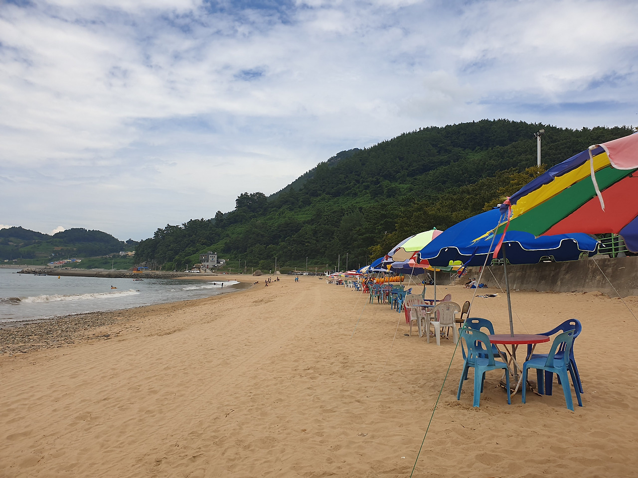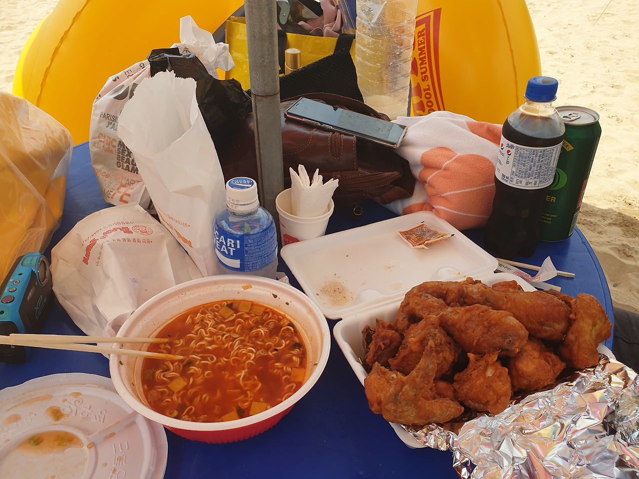 해수욕 하다가 배가 고파져서 주차장 옆에 있던 마트에 들렀다. 김치 왕뚜껑 하나와 치킨을 시켰다. 주인 아저씨가 전화번호를 적어가더니 치킨이 다 되면 연락한다고 놀고 있으라고 하더라. 아저씨가 직접 만드시는 수제 치킨! 사실 아무런 기대가 없었는데 허기가 져서 그런지 아니면 정말 맛있어서 그런 것인지, 무튼 한입 치킨을 베어 물었을 때 꿀맛이었다. 바삭바삭 갓 튀긴 치킨이 맛이 없을리 없지. 와구와구 먹어치우고 또 해수욕을 즐기다가 펜션 체크인 시간이 임박해와서 해변가로 나왔다. 짐을 다 치워두고 갈아입을 옷과 수건을 준비하고 근처 샤워장으로 향했다. 성인 2천원 요금을 내면 샤워장에서 따뜻한 물로 씻고 나올 수 있었다. 샤워장에는 아무것도 없으니 미리 샴푸, 바디워시, 수건을 챙겨가야한다. 난 챙겨가지 못해서 물만 적시고 와야했다.
