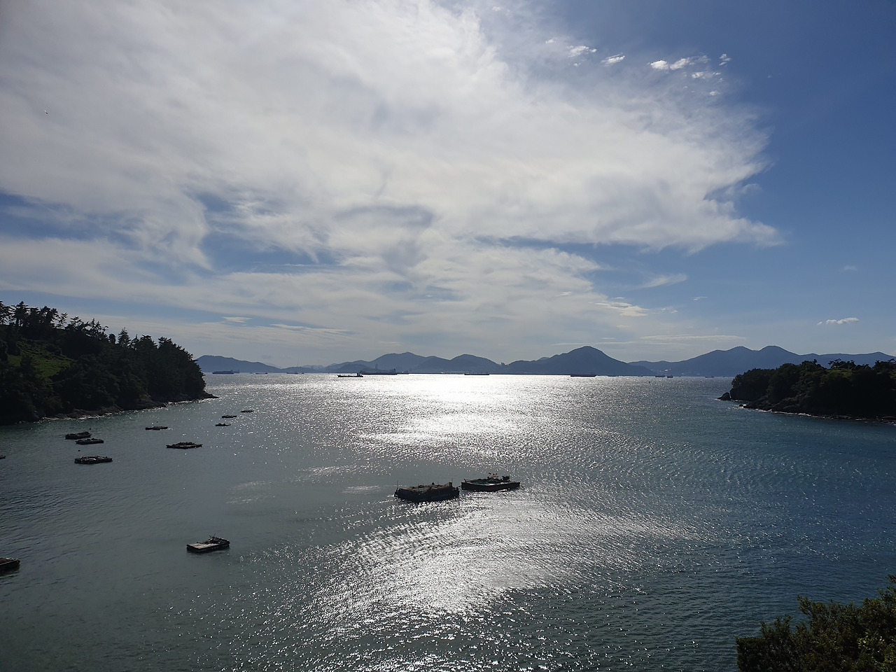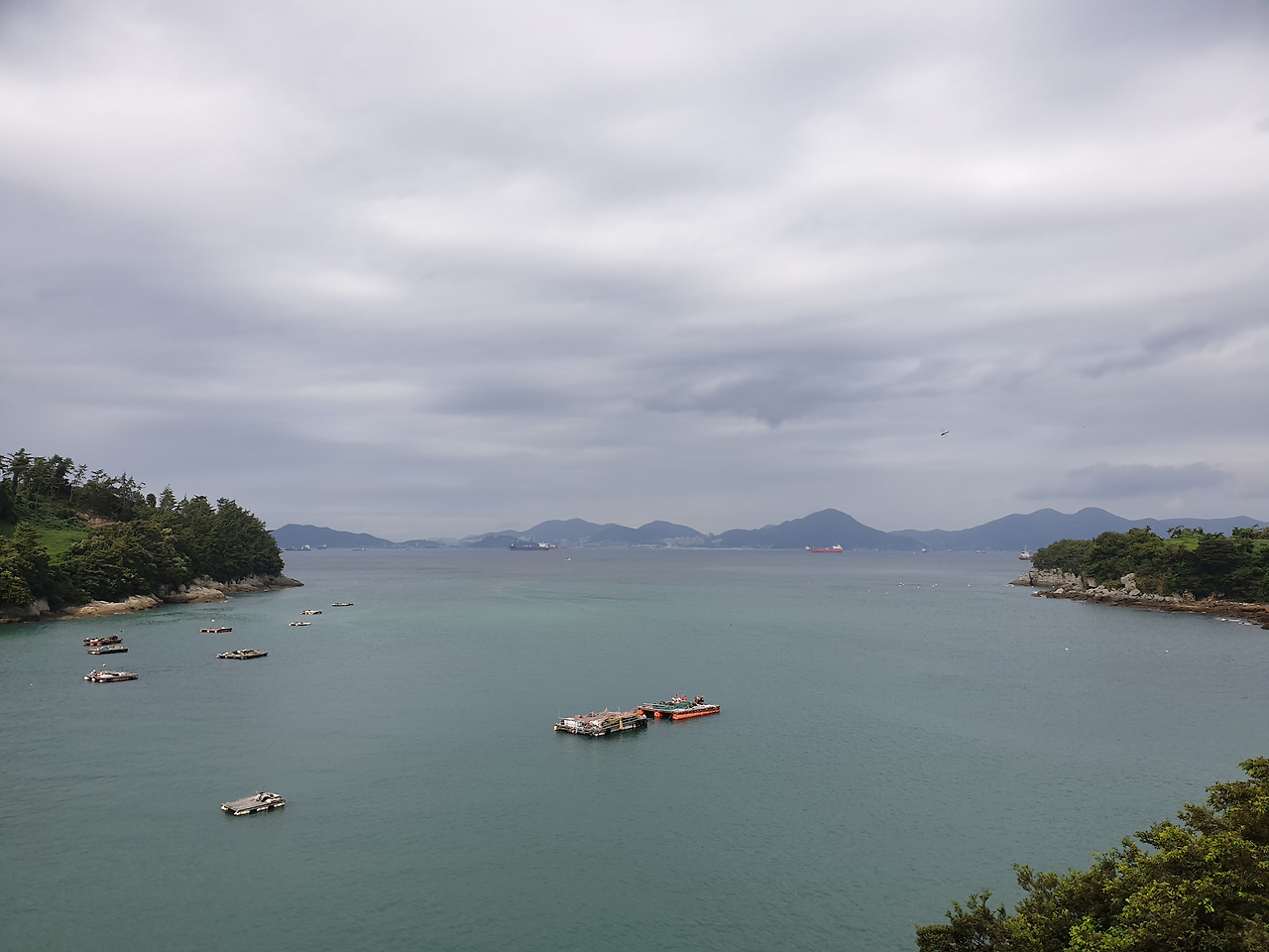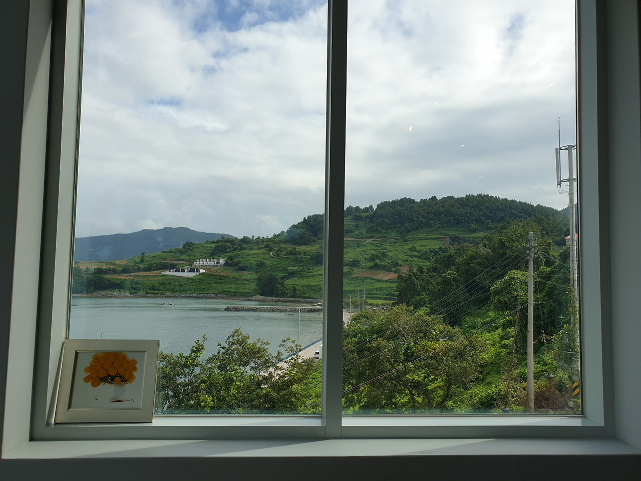 샤워장에서 샤워를 하고 나와서 마트에 잠깐 들렀다. 삼겹살이랑 구워 먹을 야채들과 과일, 군것질 거리들을 좀 사서 곧장 예약해둔 펜션으로 향했다. 체크인이 3시부터였는데 마트에 들렀다 오느라고 살짝 늦었다. 우리가 배정받은 방으로 들어가니 창 너머로 햇살에 반짝이는 바다가 보였다. 가만히 보기만해도 기분 좋은 풍경이었다. 맞은편으로 보이는 땅은 바로 여수라고 들었다. 우리는 남해와 여수 사이의 바다를 보고 있는 것이었다.