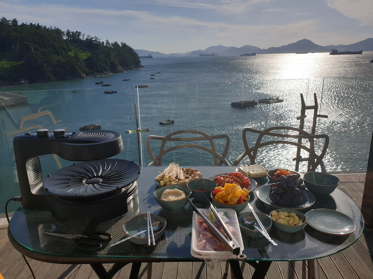 시원한 맥주로 갈증을 풀고 이번 남해 여행에서 읽으려고 데려온 책도 읽고 한가로이 시간을 보냈다. 그러다 배고파질 즈음에 저녁 준비를 시작했다. 여기는 따로 숯을 주는 것이 아니고 그릴을 제공해 주었다. 처음에는 고기가 잘 안 익는 것 같아서 이를 어쩌지 고민했다. 열이 오르는데 시간이 좀 걸려서 그렇지 고기가 타지 않고 골고루 아주 잘 익었다. 고기 뿐만 아니라 마트에서 사온 치즈랑 버섯, 파프리카를 구워 먹었는데 정말 맛있었다. 기름이 안 튀고 저온으로 계속 익히는 것인지 타지를 않아서 좋았다. 나중에 저 그릴 살려고 이름도 알아뒀지. 배가 터지게 먹고나서 다시 물 속에 뛰어 들었다.