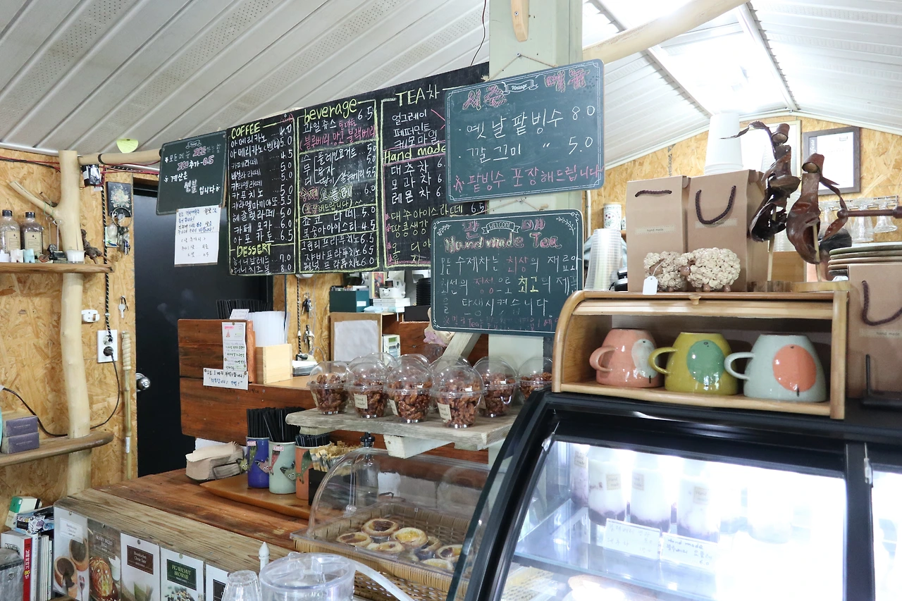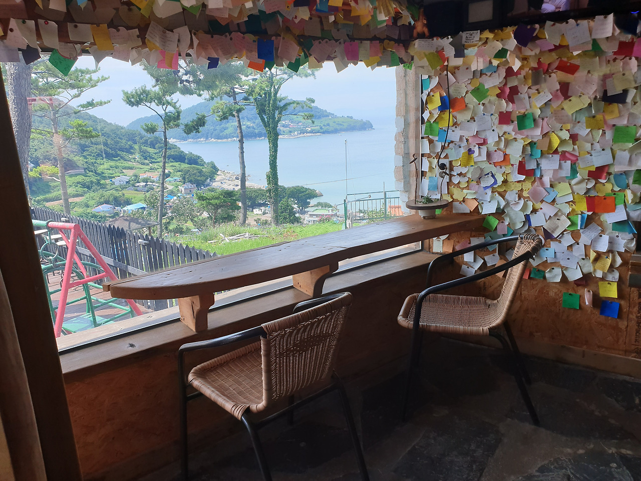 카페 곳곳에는 다양한 사람들의 추억들이 담겨져 있었다. 벽면을 지나서 천장까지 포스트잇으로 뒤덮여 있는데 그 포스트잇에 저마다의 사연이 적혀있다. 그 글귀들을 찬찬히 읽어보면 참 재미있다. 이루고 싶은 소망, 전하지 못한 사랑 고백, 어린 아이의 순진무구한 말, 남해에서 남긴 추억들... 우리도 1년 전 어느 봄날에 포스트잇을 남기고 갔었다. 사실 카페에 다시 오고 싶었던 가장 큰 이유는 우리가 그 때 남기고 간 포스트잇을 찾아보고 싶어서였다. 우리가 붙여놨던 자리에 가보니 포스트잇이 그대로 천장에 붙어 있었다. 뭉클했다.