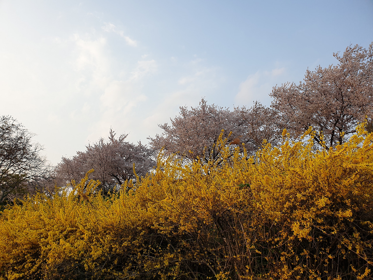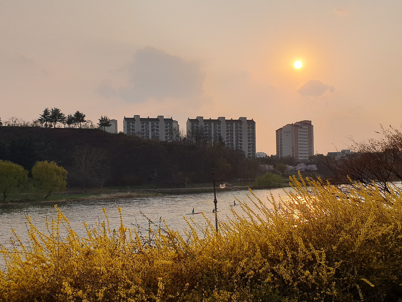 강변에는 개나리가 한창이었고 강둑 위로는 벚꽃이 한창이었다. 아래에서 위를 올려다 보면 고운 빛깔 하늘과 핑크빛 벚꽃과 노란 개나리꽃 어우러져 눈이 황홀해지는 풍경이었다.