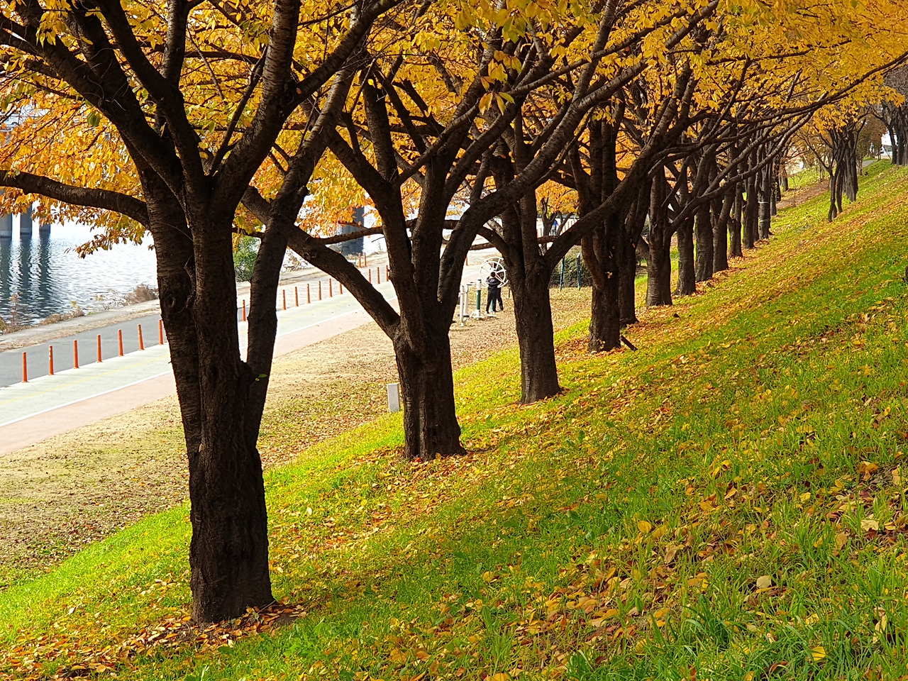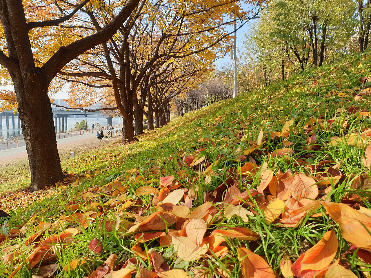 푸른 잔디 위에 붉은 잎사귀들이 무수히 떨어져있었다. 누가 가루를 뿌려 놓은 것 같다. 지난 봄 저 붉은 잎사귀들이 있던 자리에 눈 같던 벚꽃이 가득 피어있었는데 계절이 지나고 또 한해가 지나감을 느낀다.