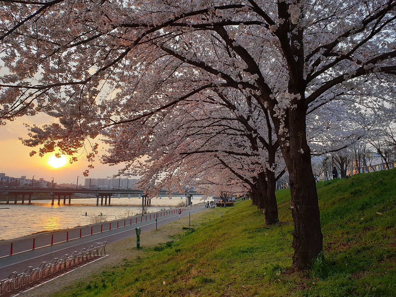 해가 저물어가는 와중 벚꽃잎은 햇살을 머금어 노랗게 다시 피어난다. 길게 늘어진 그림자들이 강물 위에서 잔디 위에서 일렁였다. 이내 해는 시야에서 사라지고 우리는 봄과 안녕했다.