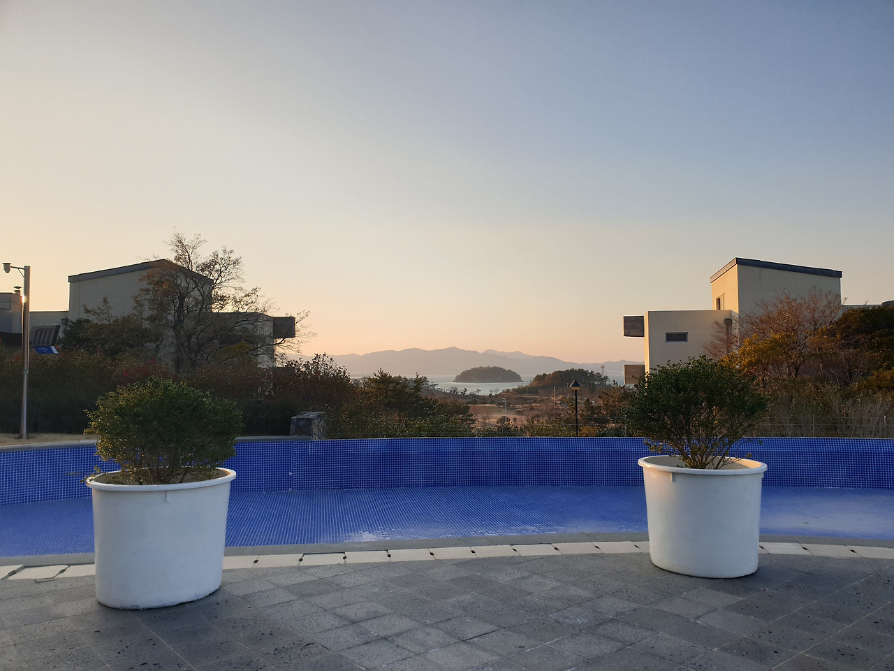 우리가 찾아온 곳은 아난티 남해 이터널 저니. 얼마전 부산으로 여행을 떠났을 때 좋은 기억으로 남았던 이터널 저니! 남해에도 있다길래, 게다가 숙소 근처여서 가보면 좋겠더 싶어 일부러 찾아왔다. 겨울이라 수영장은 텅 비어있었지만 멀리 보이는 섬과 바다, 노을이 우리를 반겨 주었다. 그리고 활짝 핀 동백꽃, 송이송이가 만개해서 화려한 모습이었다. 신나서 꽃 가까이에 다가가 몇번 코를 킁킁거리다가 돌아섰다.