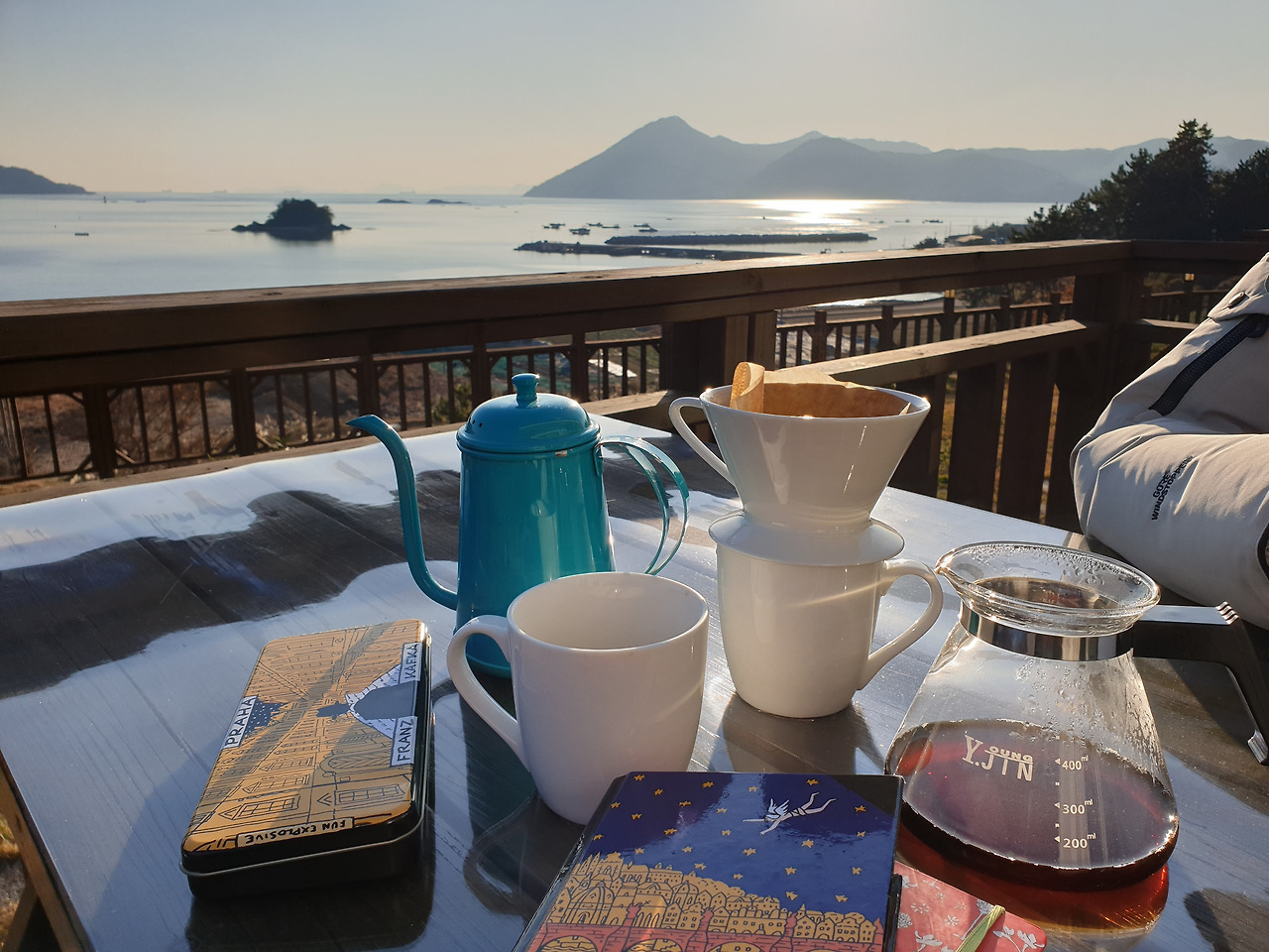 집에서 싸들고온 드립 도구들을 챙겨서 밖으로 나왔다. 데크 위 테이블 의자에 앉아 커피를 내렸다. 김이 폴폴 나는 뜨거운 커피를 마시며 아름다운 바다를 바라보고 책을 읽었다. 날씨 좋고 커피는 향긋하고 평화로운 오후 시간.