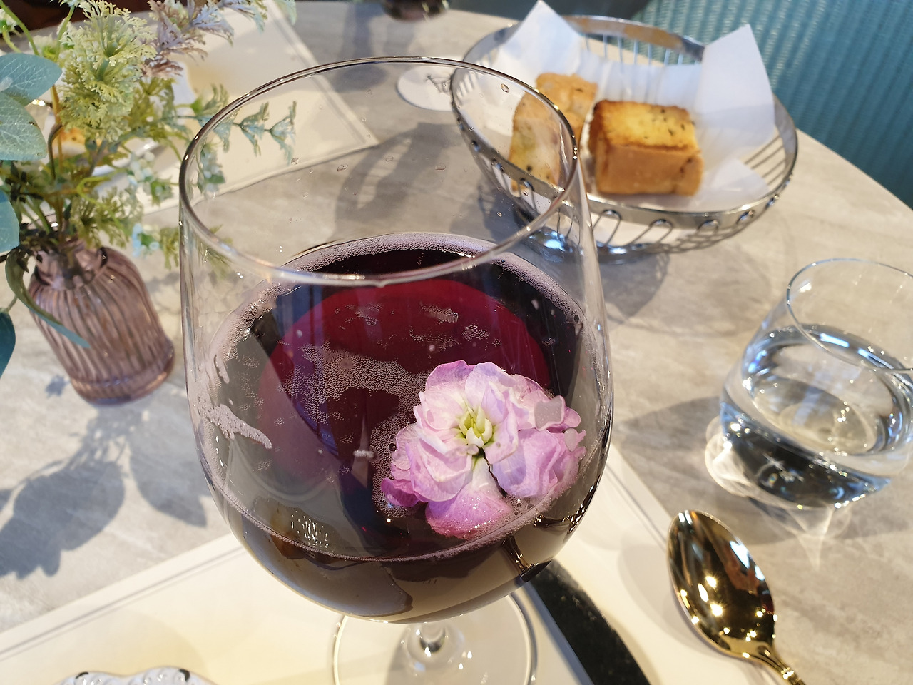 샹그리아 한 잔, 와인 위에 둥둥 떠있는 어여쁜 꽃, 향긋한 꽃내음 맡으며 와인을 입 안에 머금고..