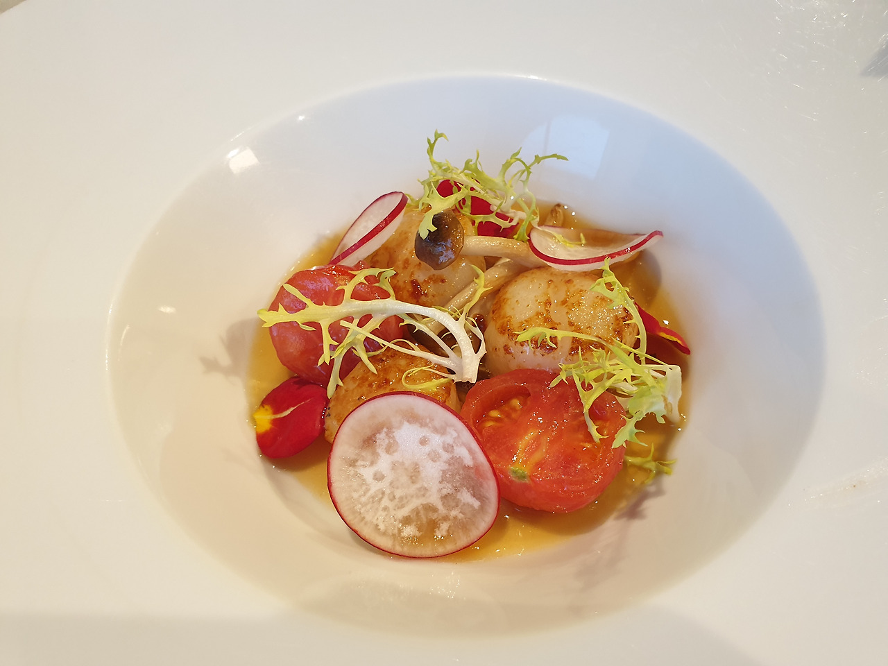 사과나무로 훈연한 관자구이와 남해산 유자를 활용한 버섯 콘소메 나무향이 은은하게 묻어 나왔다. 아삭거리는 야채랑 부드러운 관자랑, 부드러운 유자향- 제일 맛있게 먹었다.