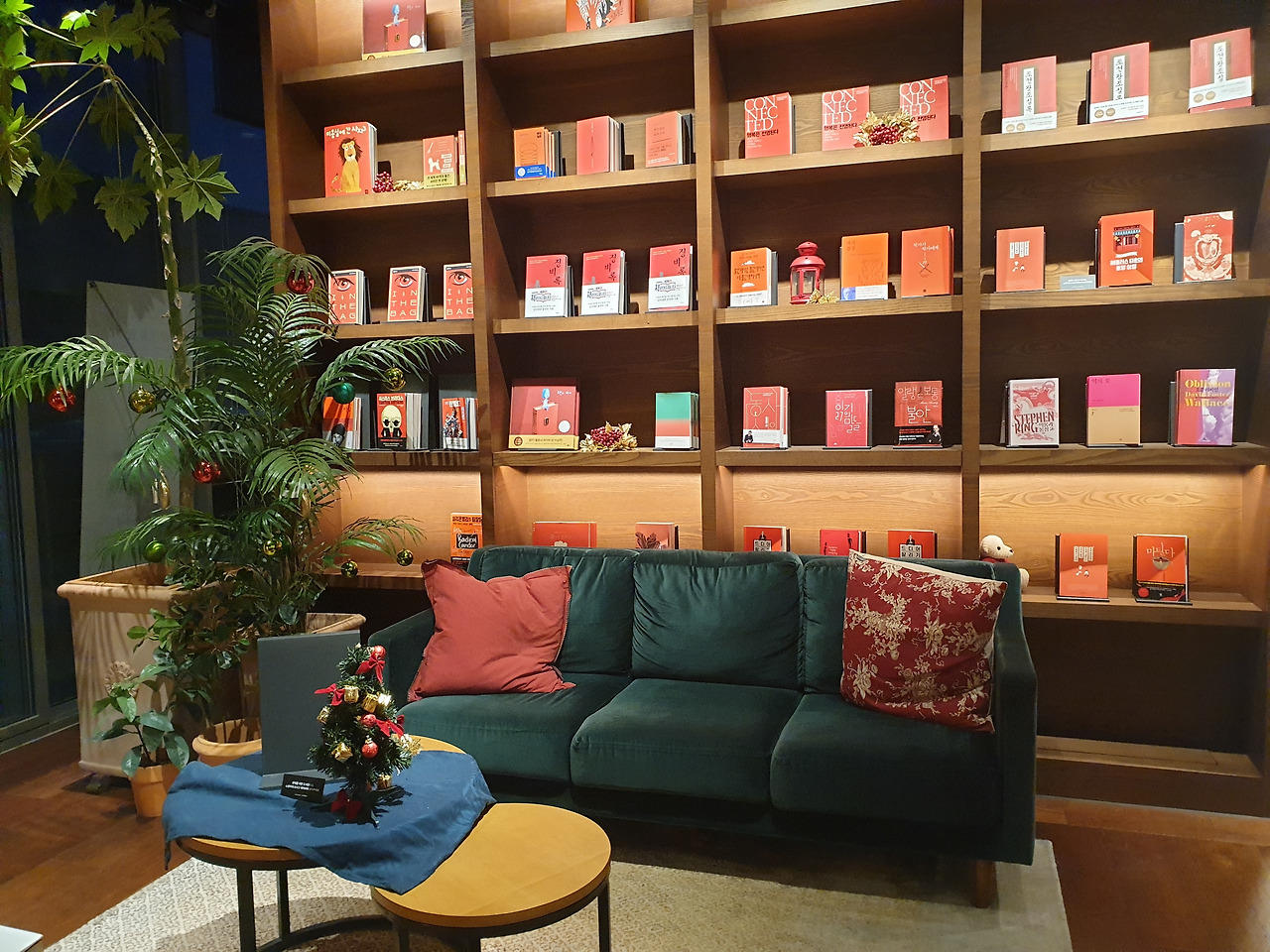 나무가 자작자작 타는 냄새가 참 좋았다. 마음이 정겹고 따뜻해지는 기분이었다. 타는 장작을 구경하다가 추위를 피해 다시 안으로 들어왔다. 역시 장작불보다 히터가 더 따뜻하구나, 허허. 저녁에 간단히 숙소에서 먹을 것들을 사고 책들을 구경하러 2층으로 올라갔다. 1층은 레스토랑 그리고 식재료들을 파는 공간이었고 2층에 올라가야 다양한 책들을 만날 수 있다.