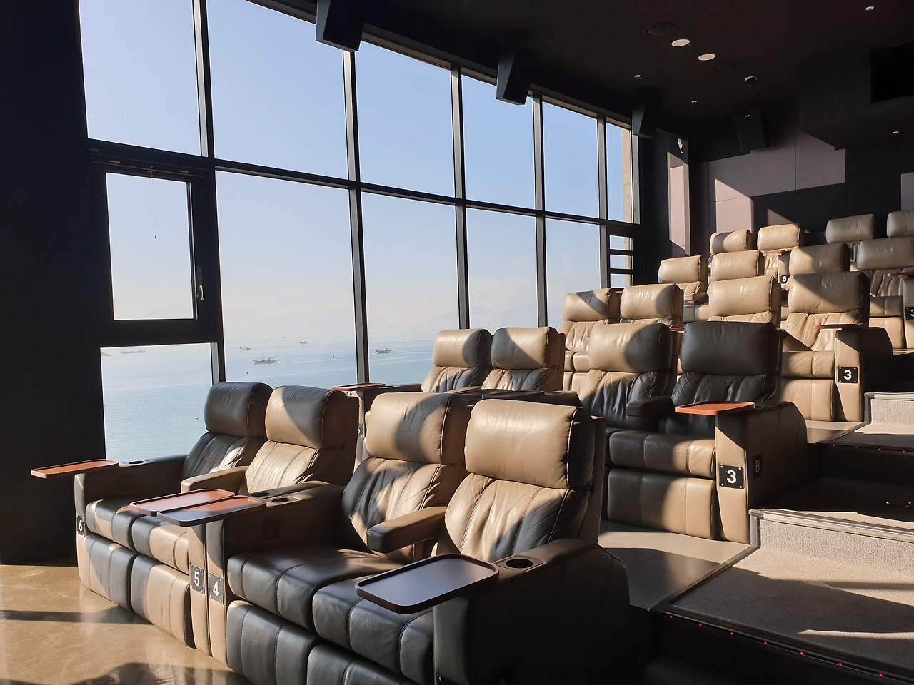입장이 시작되고 영화관 안으로 들어갔다. 우리가 들어간 곳은 1관이었는데 들어서자 마자 유리창 너머로 시원한 바다가 보였다. 진짜 바다가 보이는 영화관이구나! 푹신푹신하고 편안한 좌석에 멋진 풍경까지 마음에 쏙 드는 영화관이었다. 자리에 앉아서 바다를 바라 보고 사진도 찍으며 시간을 보냈다. 영화가 시작되자 창문 위에서 검은 커튼이 내려왔다.
