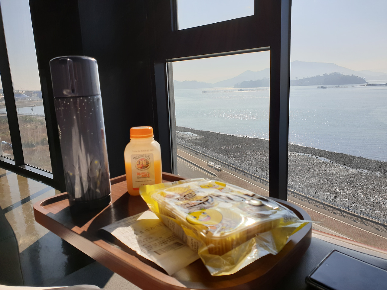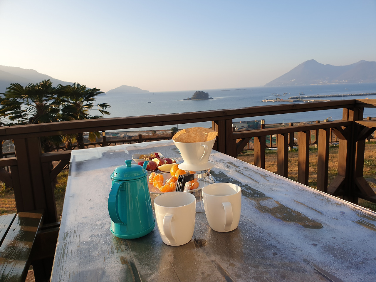 눈을 뜨자마자 발코니로 나왔다. 잔잔한 바다와 갓 떠오른 해를 머금은 하늘, 멀리 보이는 섬들과 배, 고즈넉한 어촌 풍경... 햇살이 따스해서 기분 좋은 아침이었다. 과일과 커피를 준비해서 밖에 나와서 먹었다. 좋은 풍경을 앞에 두고 먹으니 꿀맛이다.
