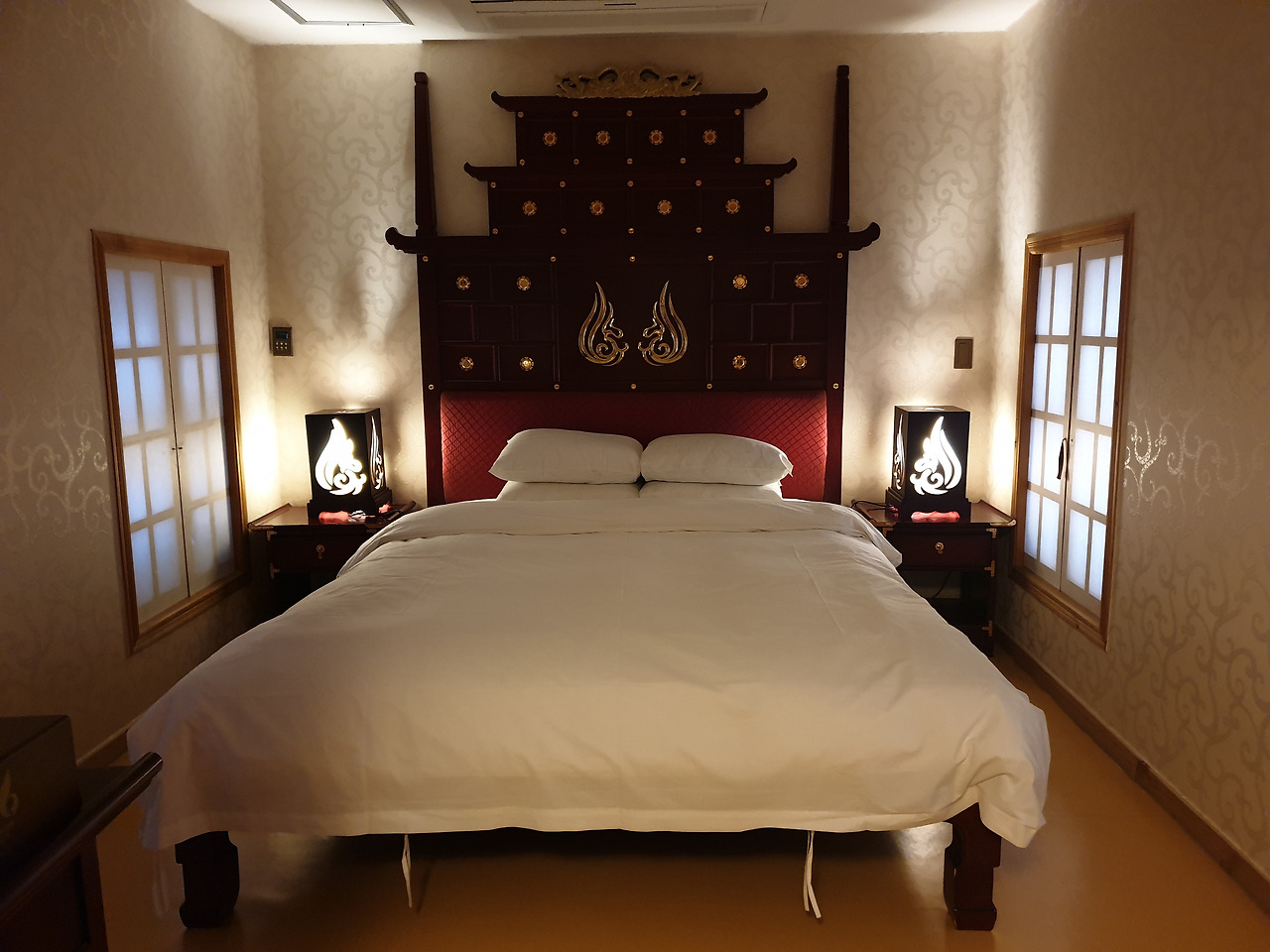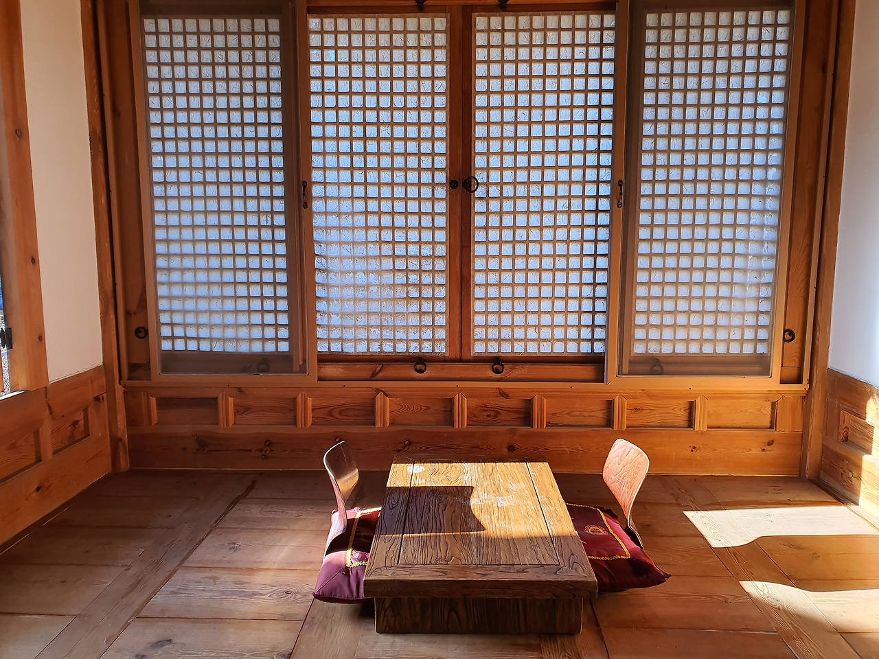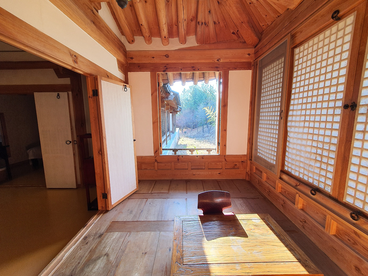 체크인 시간에 맞춰서 호텔에 도착했다. 안방에 놓인 옛스런 침대와 조명을 보니 신라시대 세트장에 와있는 것 같았다. 방 끝에는 누마루가 있었는데 창을 열었더니 방에 햇살이 가득 담겼다. 여기 앉아 겨울 햇살 받으며 사진을 찍고 차도 마셨다.
