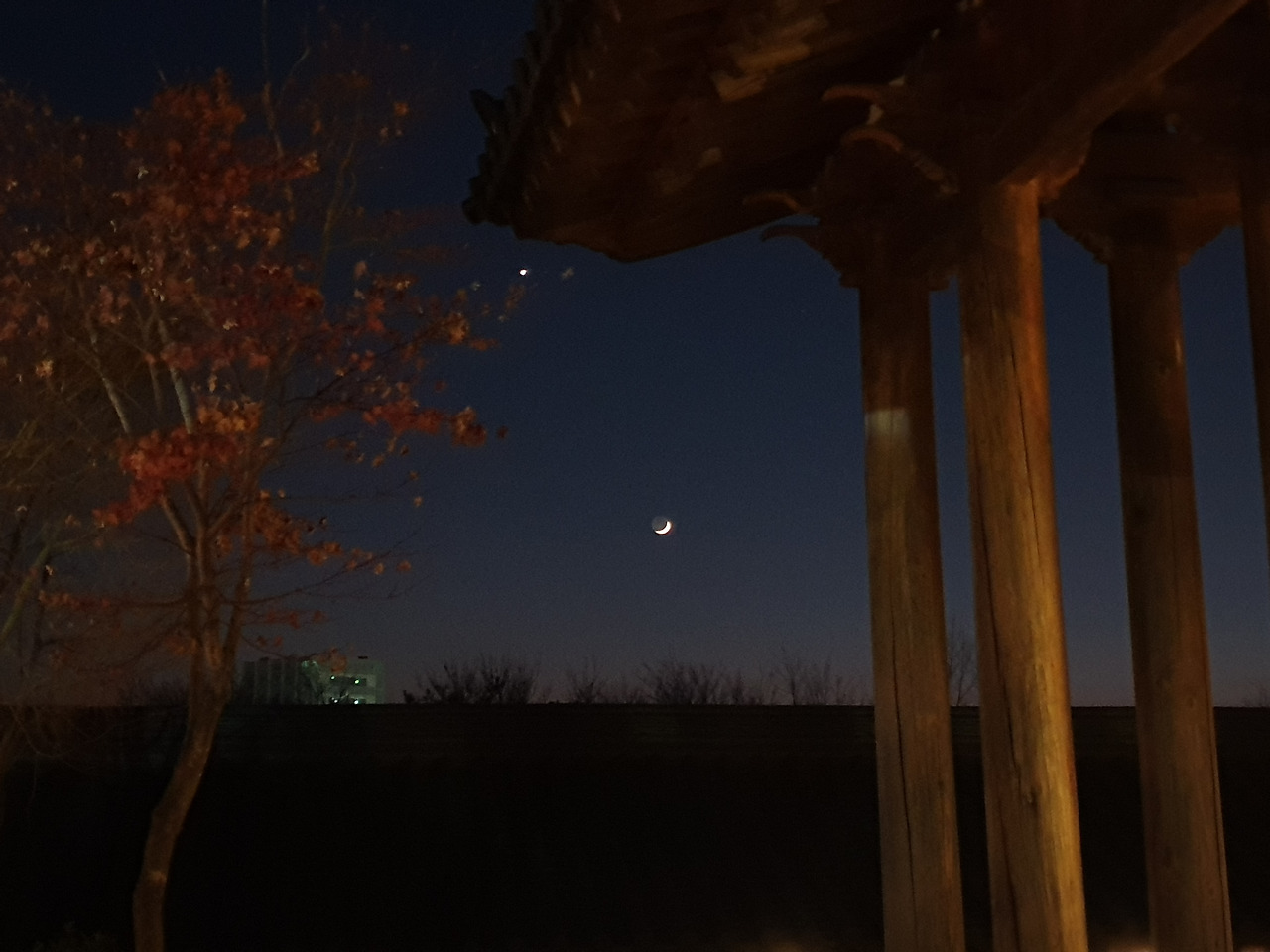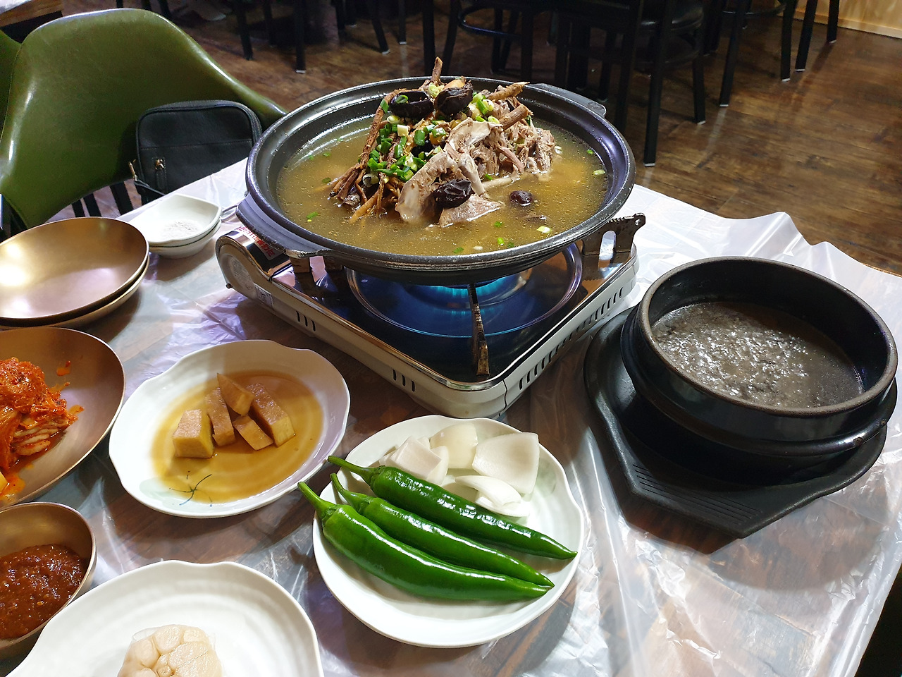 그리고 하늘에 달이 걸린 저녁에 식사를 하러 밖으로 나섰다. 뭔가 뜨끈뜨끈하고 보양되는 음식이 먹고 싶어 백숙하는 식당을 찾아갔다. 우리가 주문한 음식은 오리백숙이다. 고소한 깨죽도 같이 나왔는데 오리백숙 국물이랑 함께 먹으니 꿀맛이었다. 양이 좀 많아 보였는데 어찌저찌 먹다보니 거의 다 먹었다.