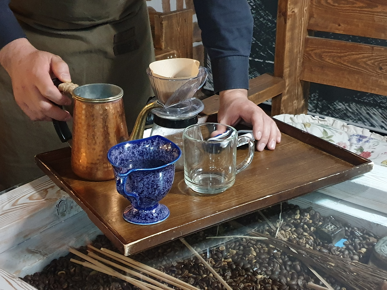 배부르게 저녁을 먹고 그냥 숙소에 들어가기 아쉬워서 바로 옆에 있는 카페에 들어갔다. 주인 아저씨 혼자 운영하시는 곳이었는데 핸드드립이 맛이 좋다 그러시길래 주문해 보았다. 주문을 하고 우리는 자리에 앉아 있었는데 아저씨가 핸드드립 도구를 챙겨 우리 자리에 오셨다. 그리고는 잔을 데우고 천천히 커피를 내려주셨는데 구경하는 재미가 쏠쏠했다.