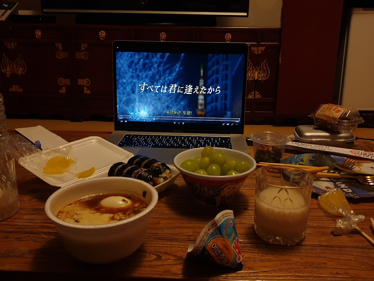 온천욕을 마치고 방 안으로 들어와서 영화를 한 편 보았다. 연말 기분을 느끼고 싶었던 우리는 영화들을 검색하다가 '두근두근 도쿄'라는 영화를 골라 보게 되었다. 영화 보면서 먹을 요량으로 경주 시내에서 교리 김밥도 사왔다. 그리고 뜨끈한 사발면에 계란과 치즈를 넣고 집에서 싸들고 온 포도에 막걸리를 곁들여 먹었다.