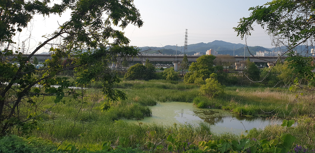 잠시 자전거를 멈춰 세우고 습지와 금호강을 바라보았다.