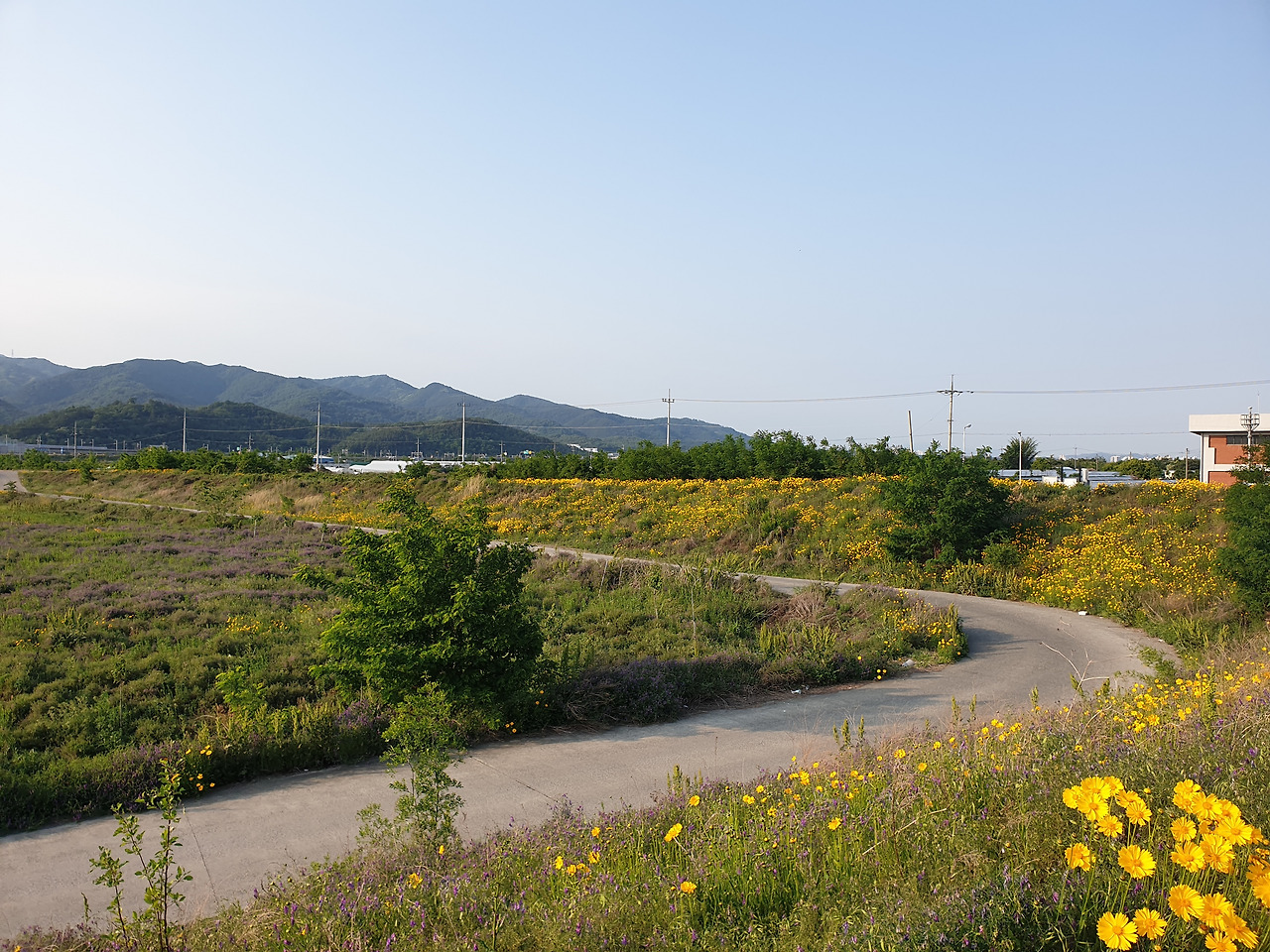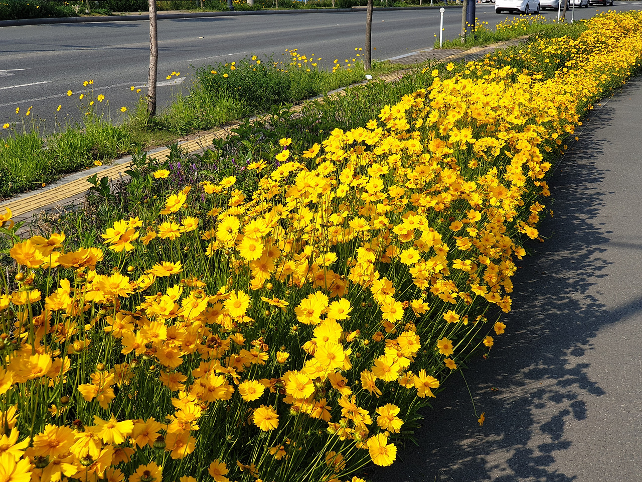 길 가장자리로 노오란 금계국들이 활짝 피어나 있었다.
