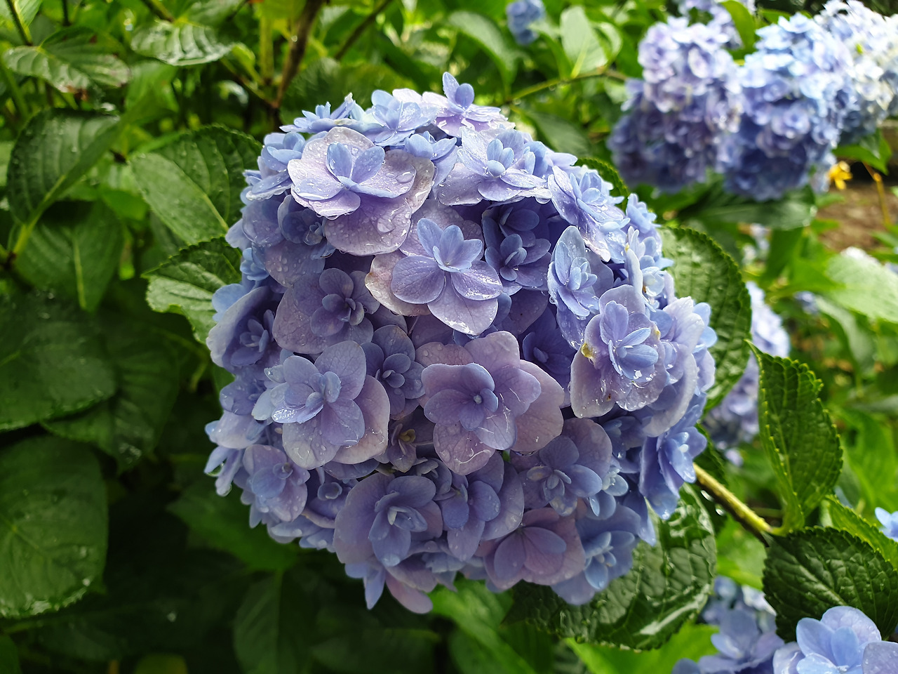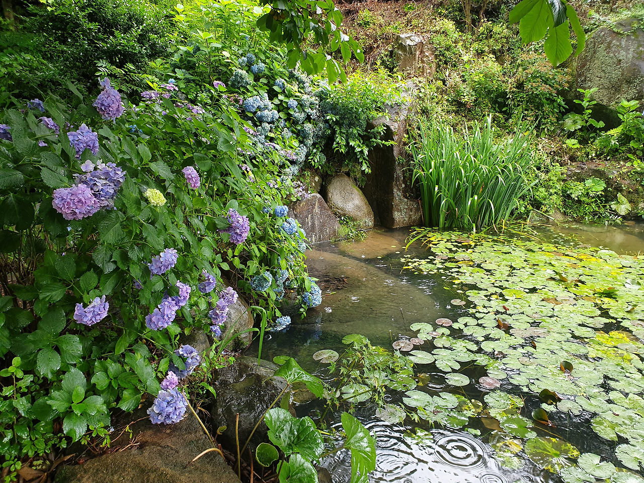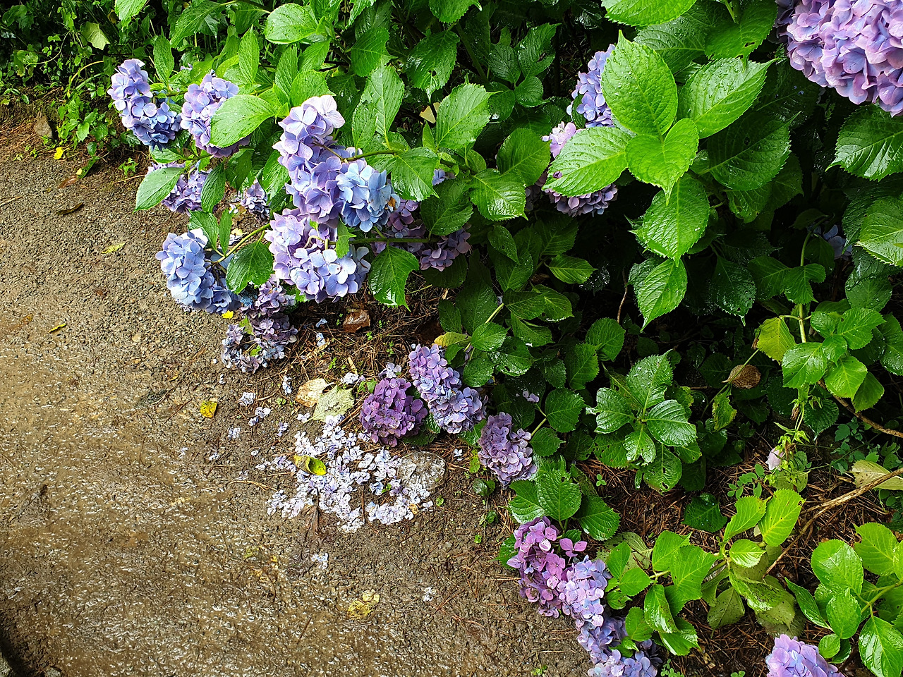 왕방울 만한 수국 꽃잎이 내 옷깃을 스칠 때면 빗방울들이 데구르르- 땅 밑으로 흘러 내렸다.