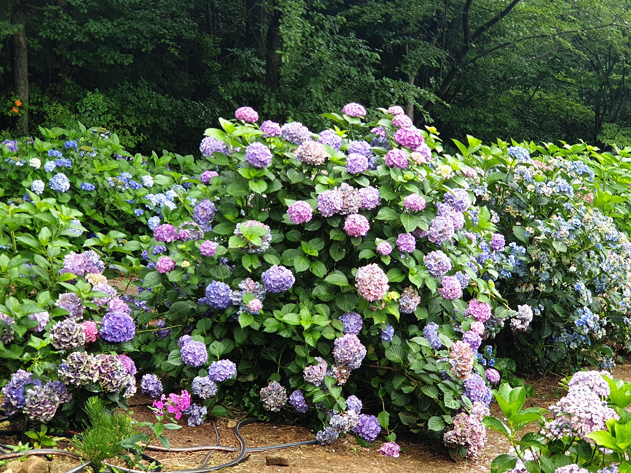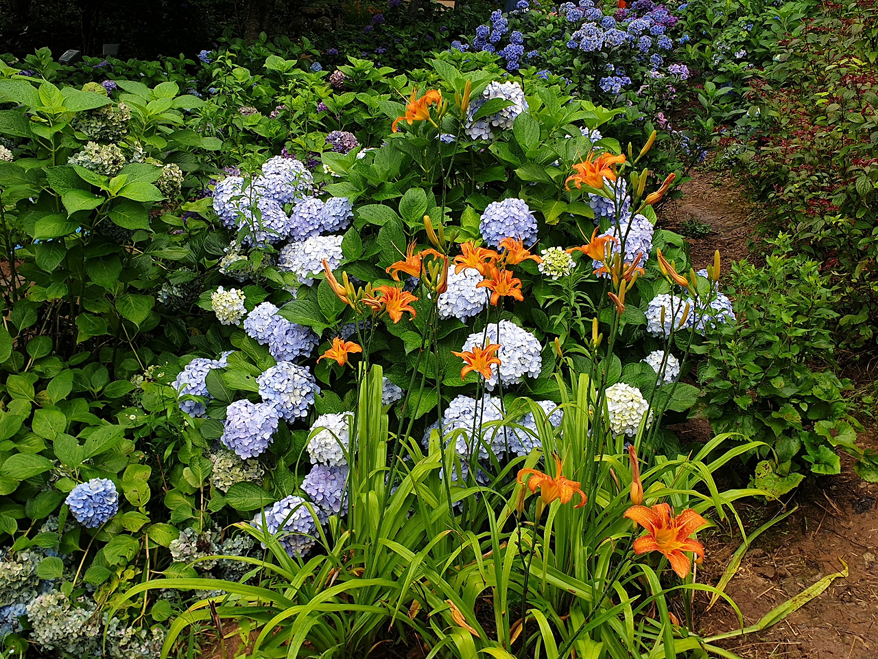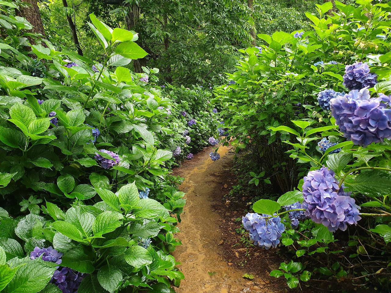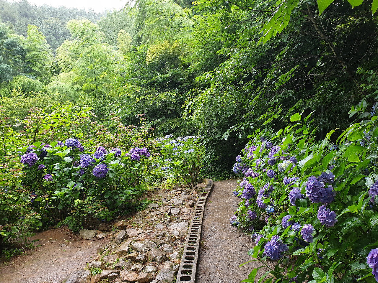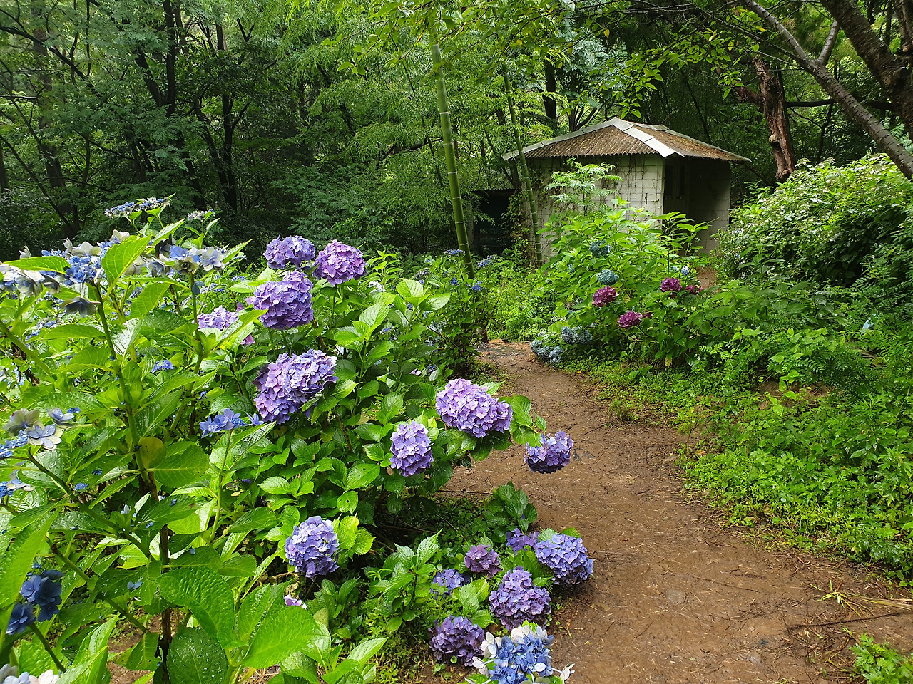 내 키보다 큰 수국 나무들이 좁은 흙 길 양쪽으로 빽빽하게 들어서 있었다.