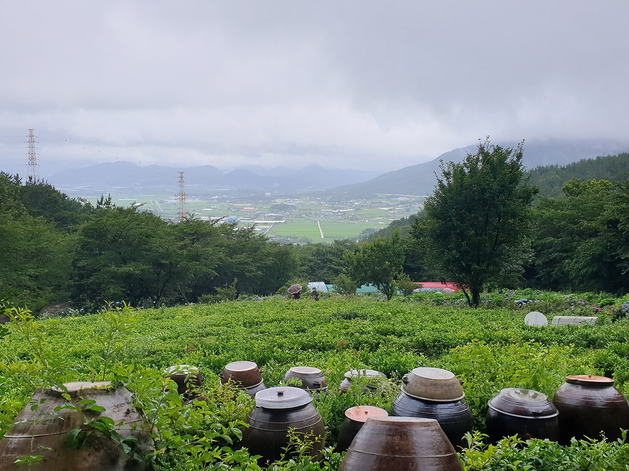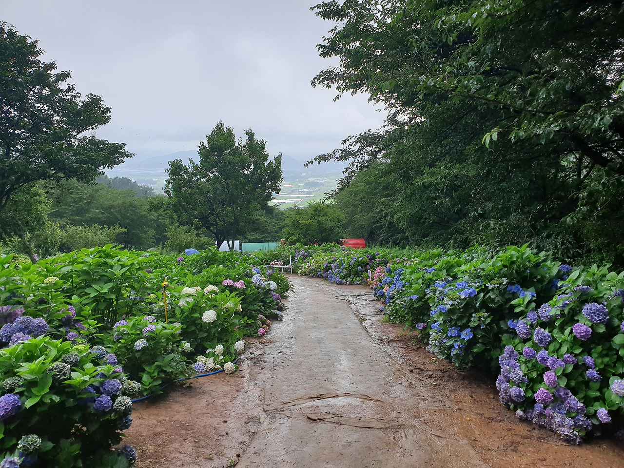 넓게 펼쳐진 수국 꽃밭과 멀리 푸른 논과 집들이 보였다.