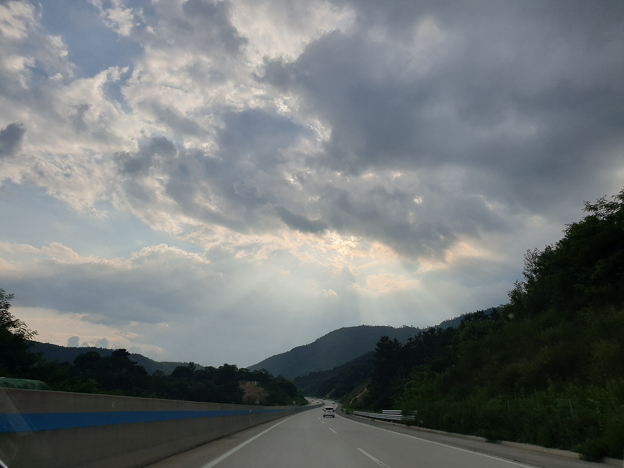 맑은 날, 퇴근하고 구례로 출발했다. 고속도로를 달리고 있는데 구름 사이사이로 햇살이 삐죽삐죽 들이쳤다. 멀리 보이는 산들은 푸른 나무 옷을 가득 껴입었다.