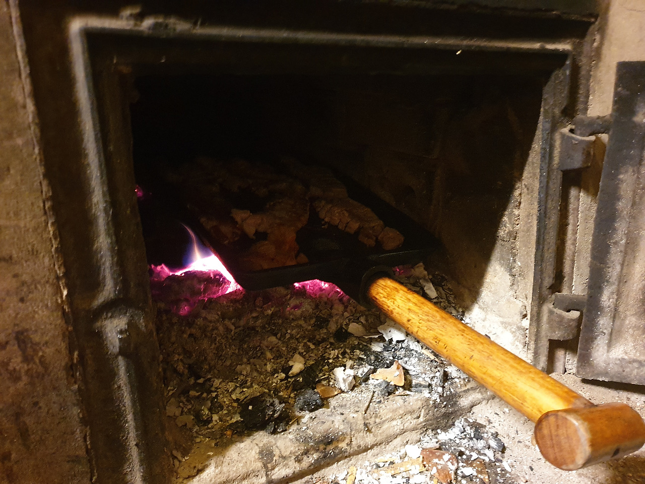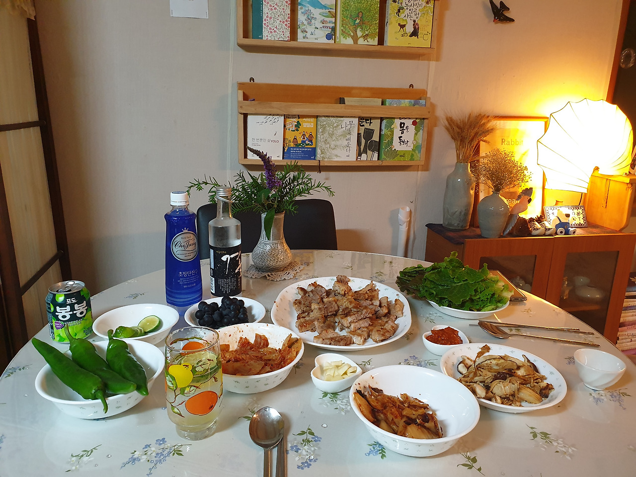 일단 사온 술과 음료들을 차곡차곡 냉장고 안에 넣었다. 그리고 고기와 같이 구울 야채들을 씻고 정리하며 즐거운 저녁 식사를 준비했다. 우리는 삼겹살을 집어 들고 집 밖으로 나와 아궁이 쪽으로 걸어갔다. 커다란 장작들이 아궁이 안에서 시뻘겋게 타고 있었다. 우리는 삼겹살을 올린 무거운 그릴을 아궁이 안으로 집어 넣었다.