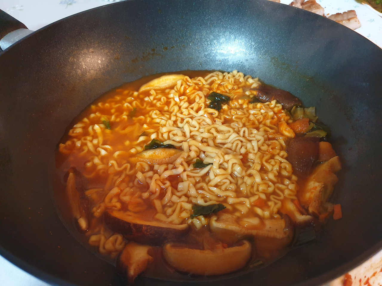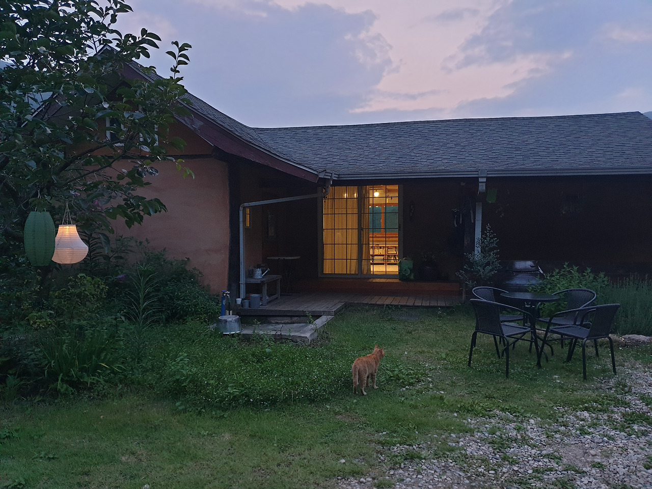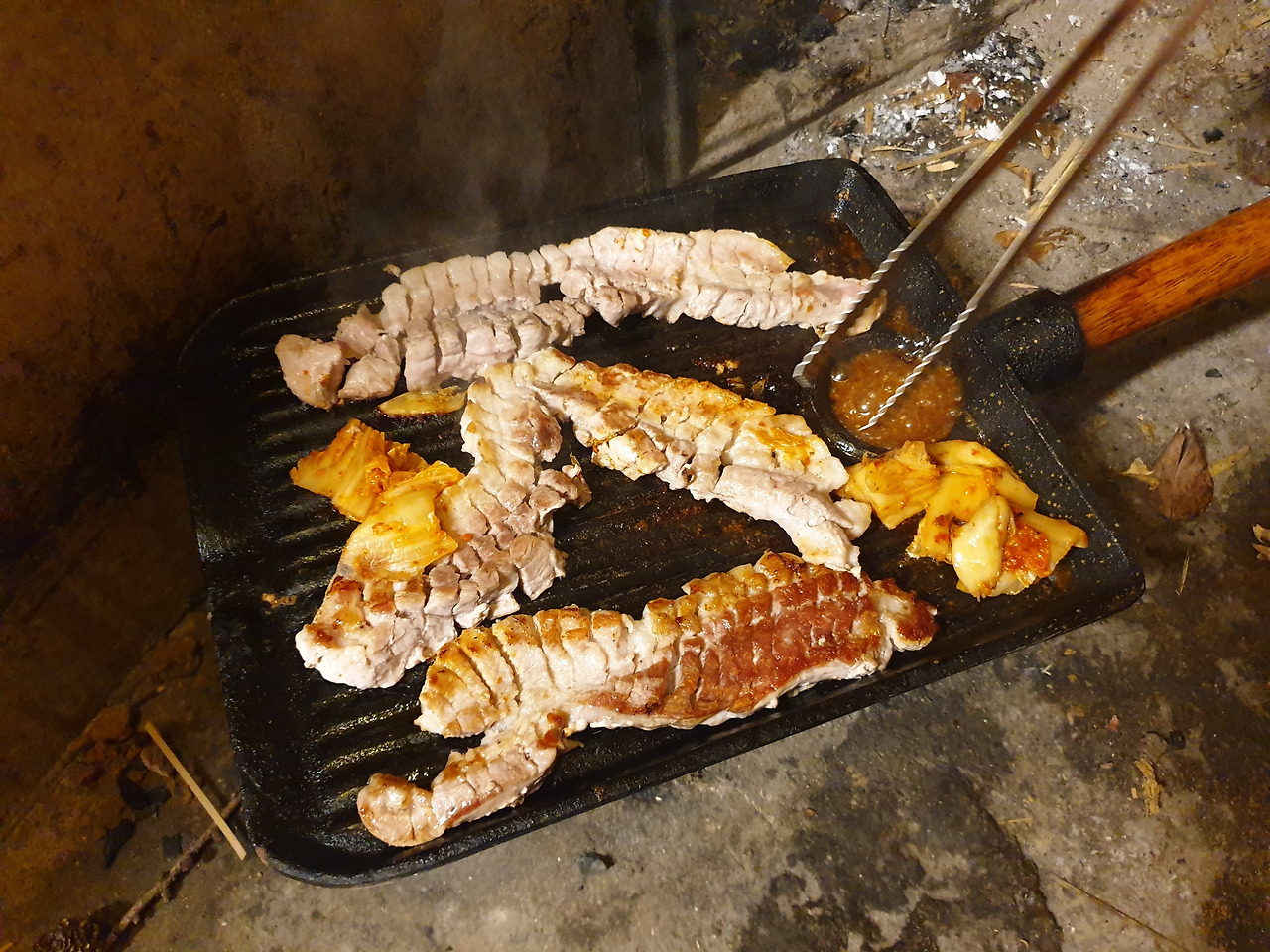 고양이의 눈길이 어찌나 부담스러웠던가! 숙소 안으로 들어오니 비로소 마음이 편안해졌다. 늦은 저녁 시간, 배가 엄청 고팠던지라 허겁지겁 고기들을 뱃속으로 집어 넣었다. 장작불에 구워서 그런지 더 맛있게 느껴졌다. 그리고 호스트분께서 주신 김치! 고기 기름에 구워진 김치의 맛이 아주 환상적이었다. 마지막은 우리가 좋아하는 뜨거운 국물 라면으로 마무리.