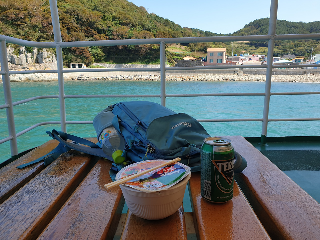 비진도 내항에 도착했을 즈음, 배 안에 있는 작은 매점에서 육개장 컵라면과 캔맥주 하나를 사왔다. 상쾌한 바닷바람을 맞으며 뜨끈한 육개장 국물과 시원한 캔맥주를 들이키니 무릉도원이 따로 없었다.