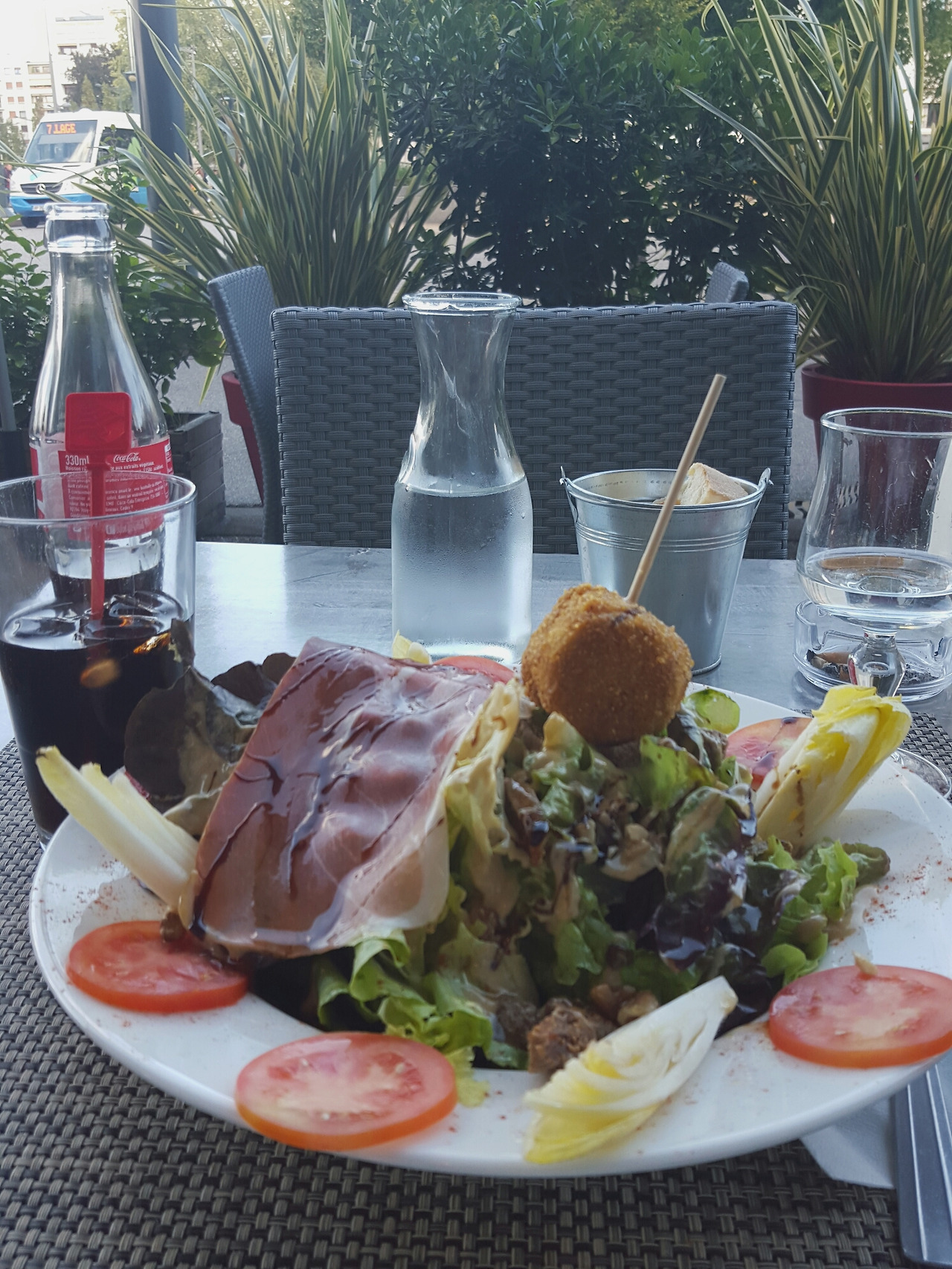 리옹역 근처에 있는 어느 레스토랑 안으로 들어갔다. 무얼 먹을까 고민하다가 크로켓이 들어간 샐러드 하나와 콜라를 한 병 시켰다. 한국에서 늘상 자유롭게 먹던 물을 이곳에서는 돈을 주고 사서 마셔야 했다. 유럽의 물은 석회 성분이 많아 생수를 많이 사먹는다고 들었다. 여기서 물을 사 먹으려니 왠지 돈이 아깝다는 생각이 들어서 콜라를 주문하게 되었다. 그런데 여기 음식들이 기름지고 느끼해서 그런지 콜라와 찰떡궁합이었다. 가볍게 먹으려고 샐러드를 시켰는데 양이 꽤나 많았다. 샐러드는 항상 간식이나 곁들이는 음식으로 생각했었는데 아니었다. 같이 나온 빵과 곁들어 먹으니 한 끼 식사로 충분했다.
