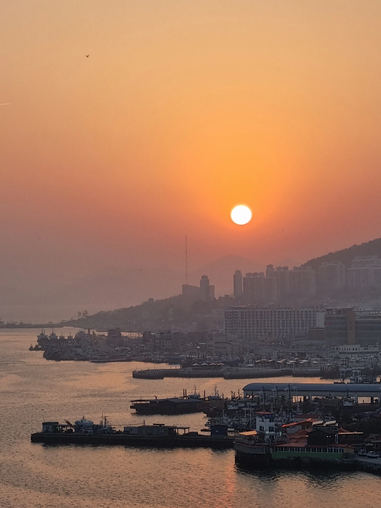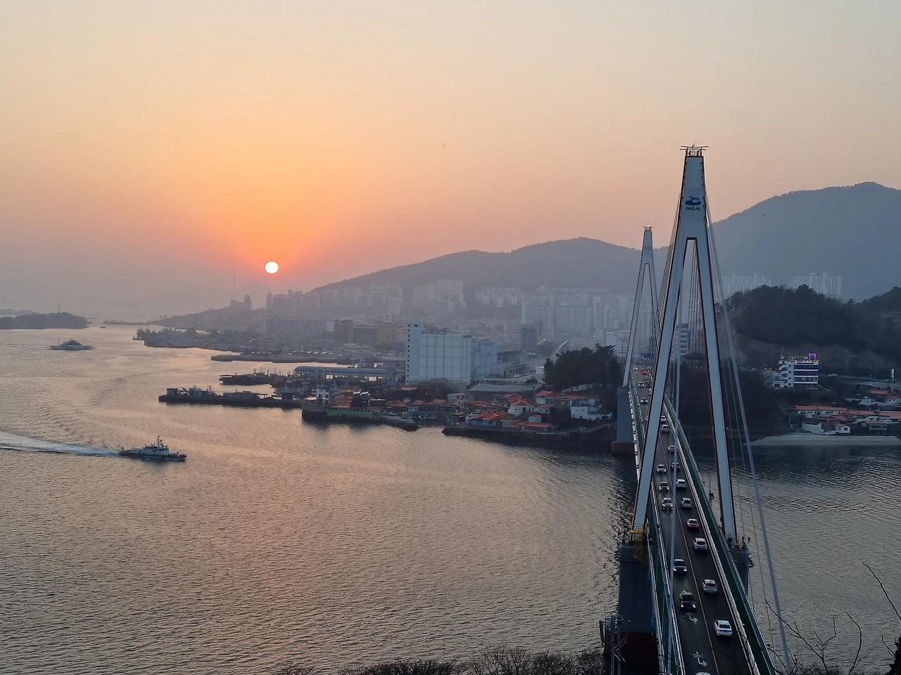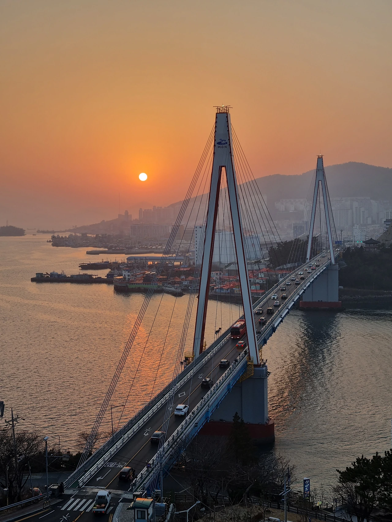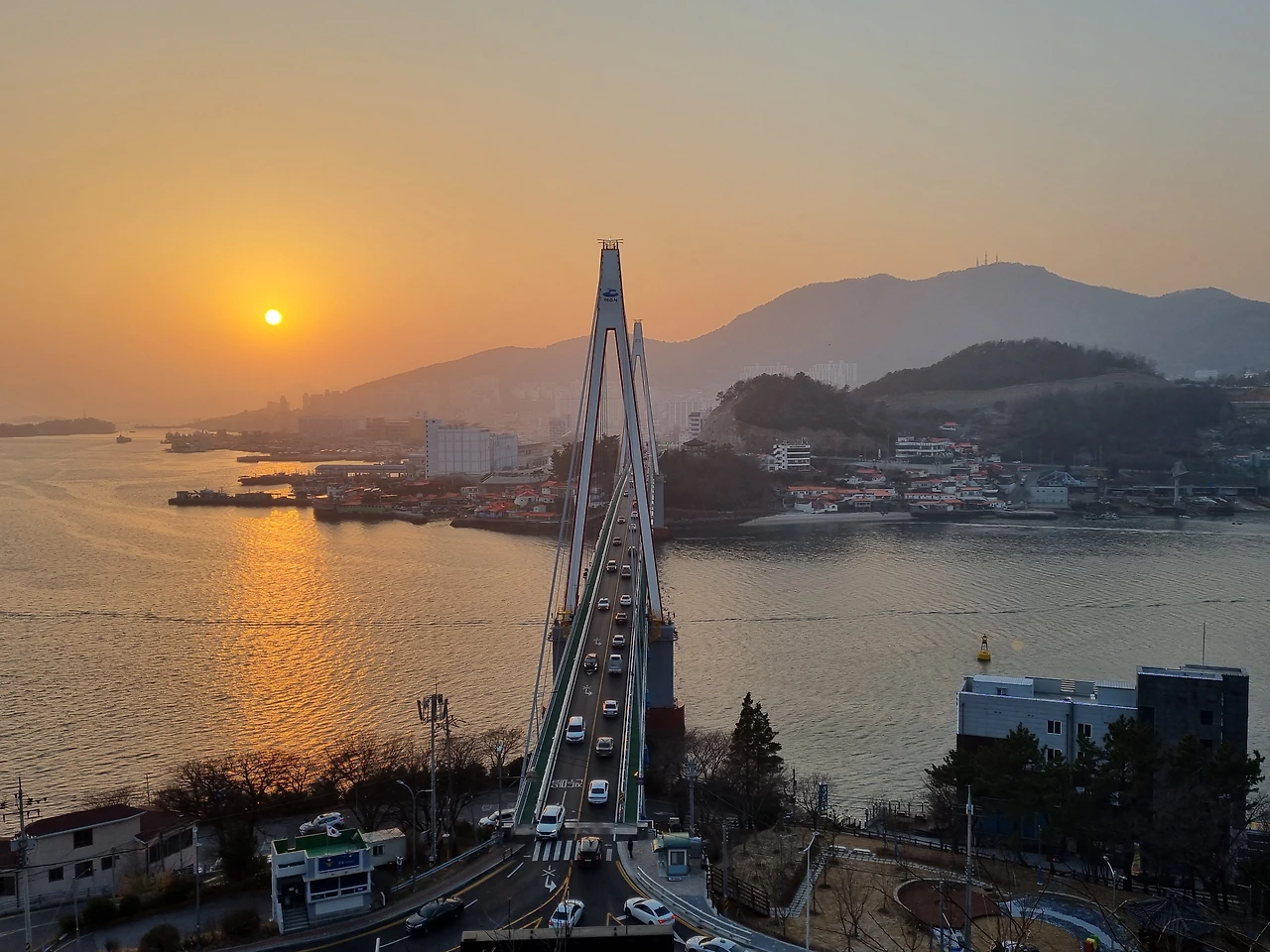 아래로 내려와 돌산대교 왼편으로 떨어지고 있는 해를 바라보았다. 멀리 길게 늘어진 산의 실루엣이 보였다. 노을은 하늘을 가득 적셨고 바다 위에 붉은 길을 만들었다. 구름 한 점 없는 맑은 날이라 그런지 해가 더 동그랗게 잘 보였다.