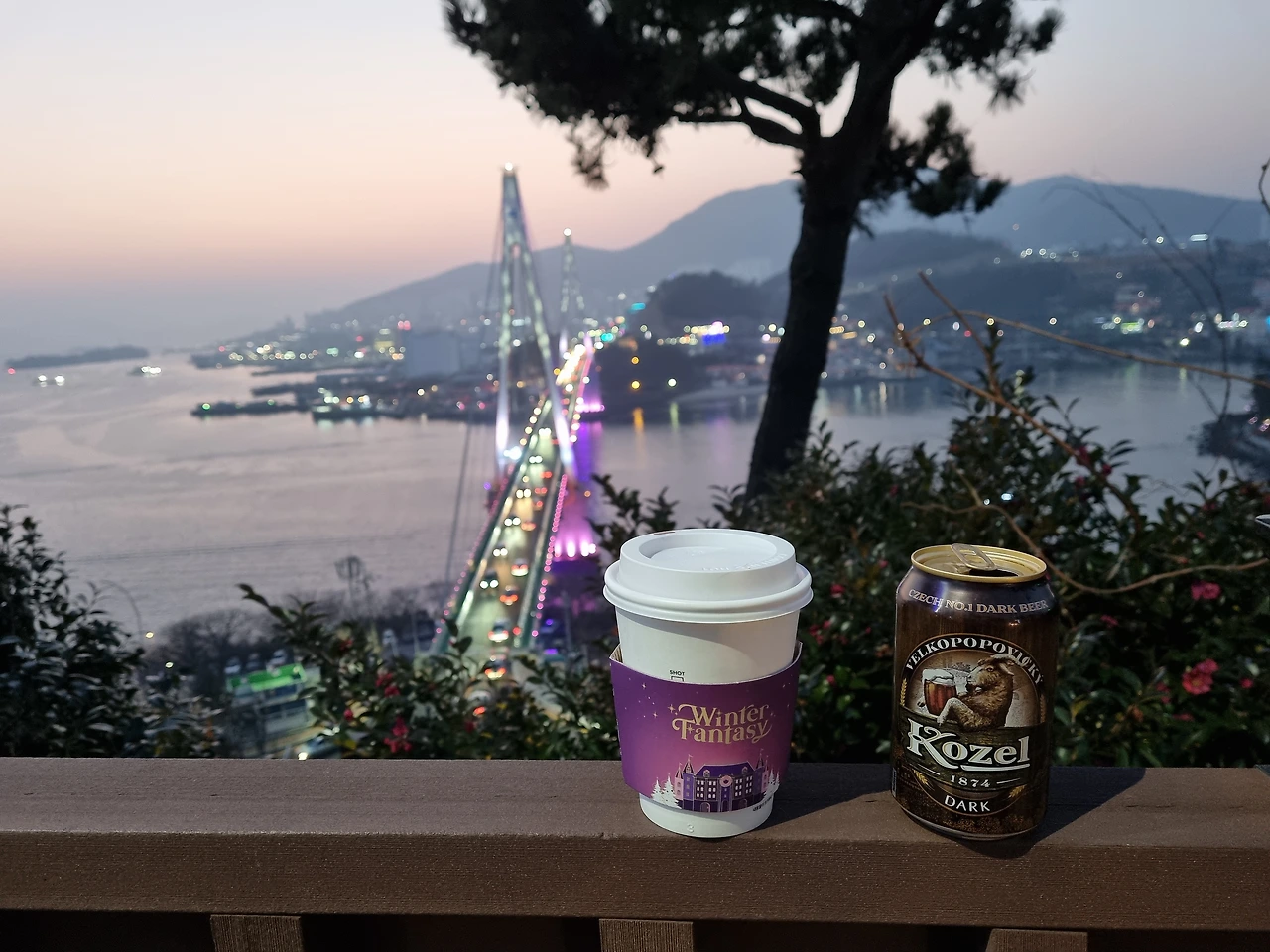 더 어두워지기 전에 마실 것들을 사러 공원 위쪽으로 올라왔다. 케이블카 매표소 근처에 먹을 것들을 파는 상점들이 많았다. 우리는 잠깐 편의점에 들러서 맥주 한 캔을 샀고 커피숍에 가서는 따뜻한 무알콜 뱅쇼를 사왔다.