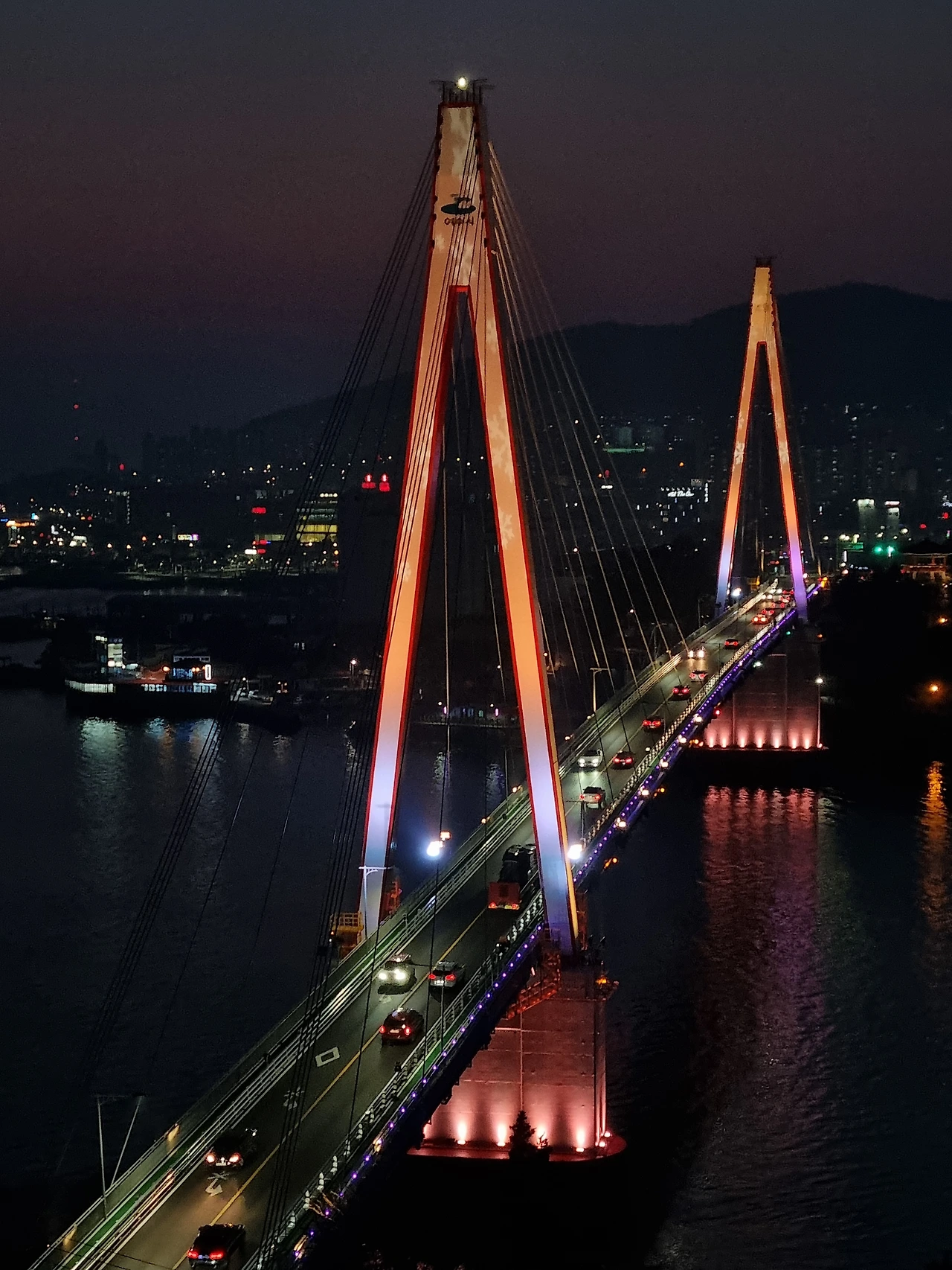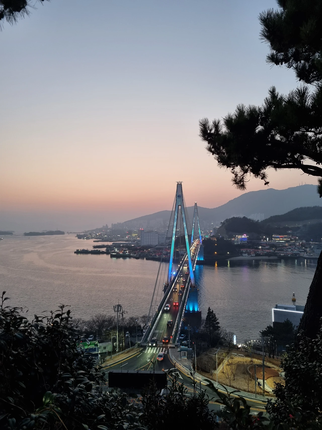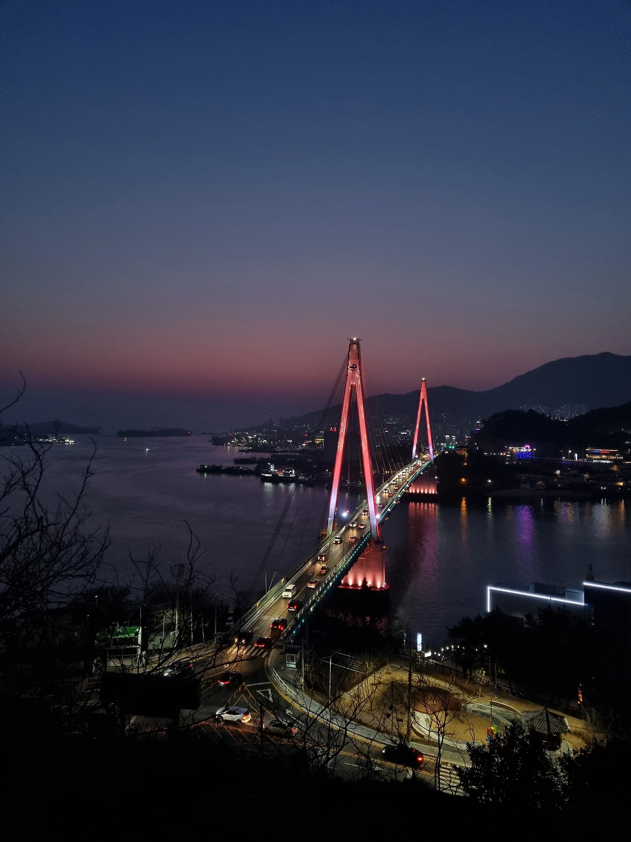 해가 넘어가고 하늘에 아직 붉은 기운이 어렴풋이 남아있을 때 돌산대교에 불이 번쩍 켜졌다. 파란빛, 보랏빛, 빨간빛 등등 다양한 빛깔로 모습을 바꾸던 돌산대교.