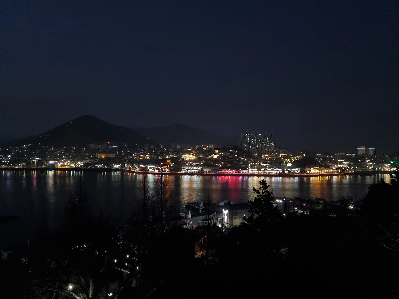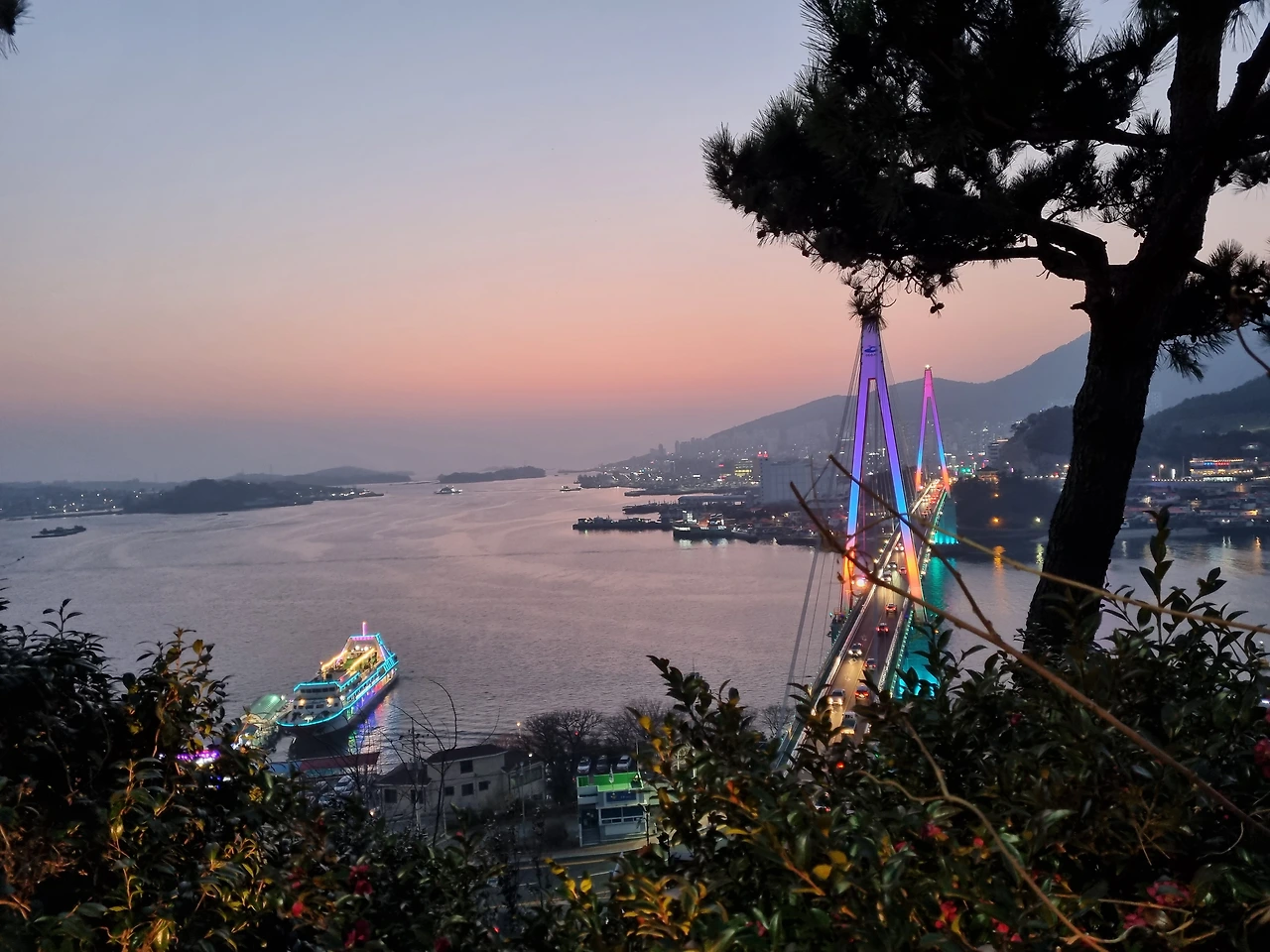 우리는 나무 난간에 기대어 더 어두워지길 기다렸다. 태양이 지나간 하늘은 무척 아름다웠다. 점점 더 어둠이 짙어지고 있었고 돌산대교는 여러 색깔로 반짝였다. 곧이어 유람선에도 불이 켜졌다. 우리가 기대어 있던 난간 근처에 동백꽃들이 제법 피어있어 눈이 즐거웠다.