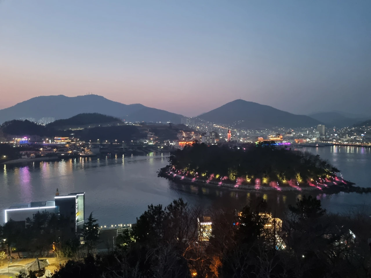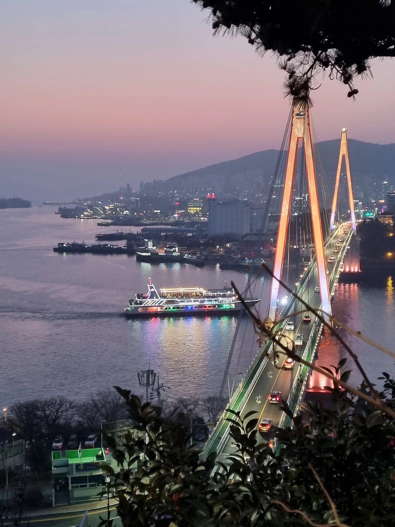 어느새 하늘과 바다는 몽환적인 보랏빛으로 변했다. 보랏빛 바다 위에서 반짝거리며 유람선은 돌산대교 아래로 지나갔다. 그리고 다리 옆 작은 섬도 지나쳐갔다. 유람선에서 흘러나온 음악이 돌산공원에 서있는 우리에게까지 들렸다.